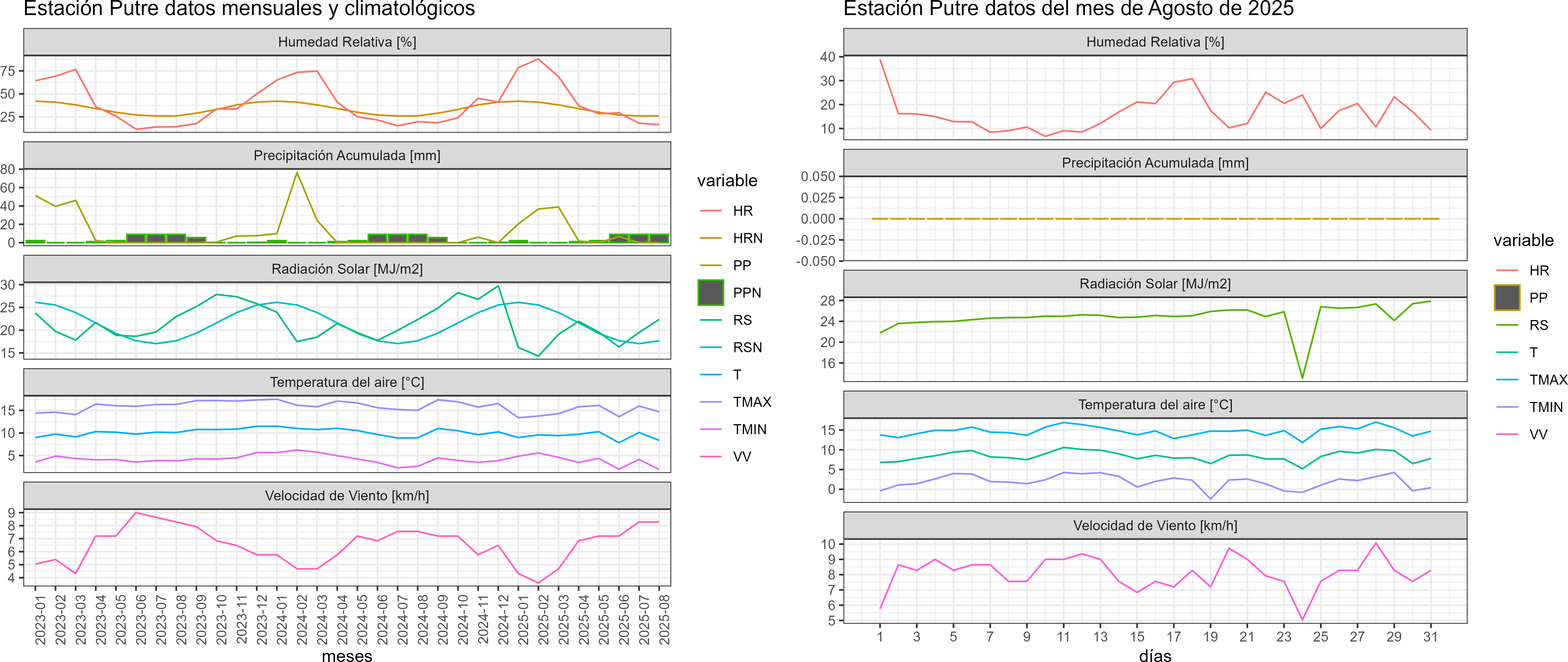 La estación Putre corresponde al distrito agroclimático 15-3-4. Para este distrito climático la temperatura mínima, media y máxima climatológicas alcanzan los 0.3°C, 6.4°C y 12.4°C respectivamente. Por su parte, respecto a las temperaturas medidas durante el mes de agosto en la estación: la temperatura mínima alcanzo los 1.9°C (1.6°C sobre la climatológica), la temperatura media 8.4°C (2°C sobre la climatológica) y la temperatura máxima llegó a los 14.7°C (2.3°C sobre la climatológica). En el mes de agosto se registró una pluviometría de 0 mm, lo cual representa un 0% con respecto al mismo mes de un año normal. De enero a agosto se ha registrado un total acumulado de 104.4 mm, en circunstancias que un año normal registraría a la fecha 266 mm, lo que representa un déficit de 60.8%. A la misma fecha, durante el año 2024 la precipitación alcanzaba los 0 mm.