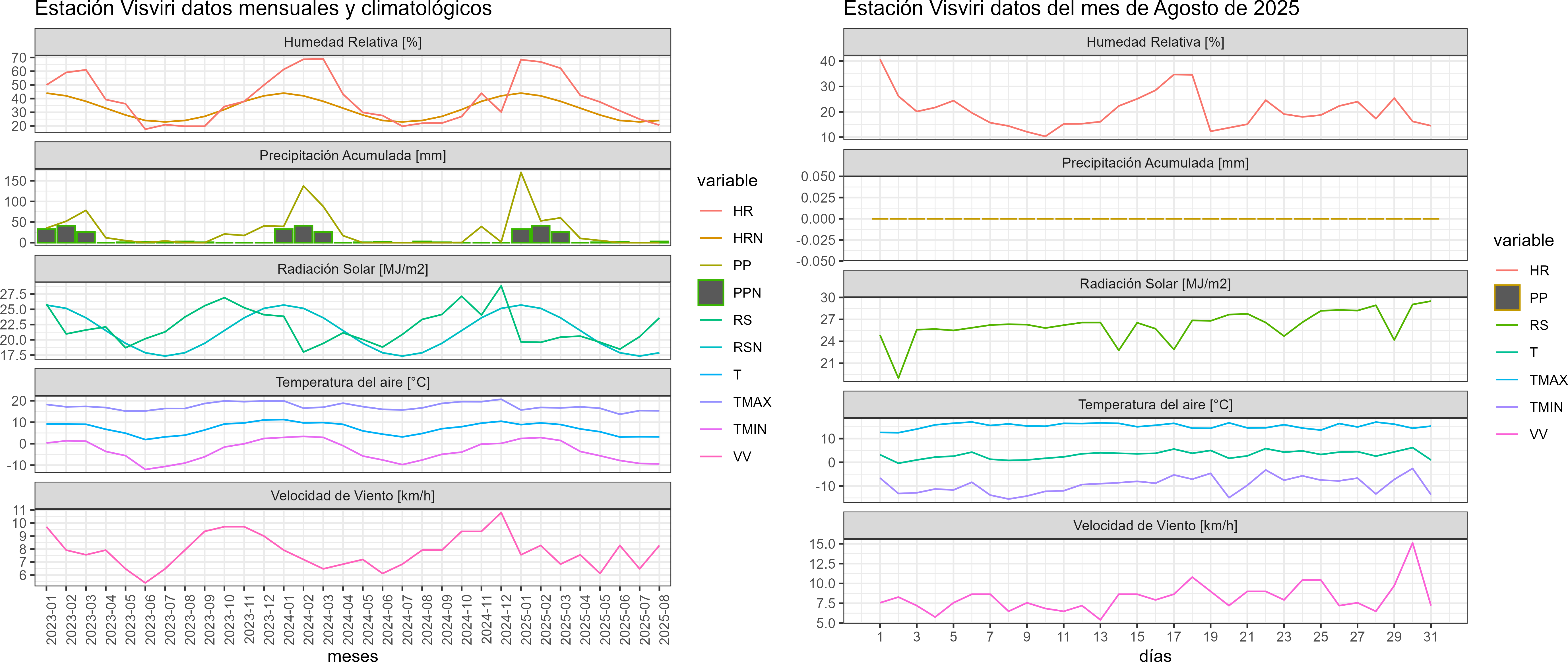 La estación Visviri corresponde al distrito agroclimático 15-3-5. Para este distrito climático la temperatura mínima, media y máxima climatológicas alcanzan los -8.5°C, 3.2°C y 15°C respectivamente. Por su parte, respecto a las temperaturas medidas durante el mes de agosto en la estación: la temperatura mínima alcanzo los -9.4°C (-0.9°C bajo la climatológica), la temperatura media 3.2°C (Igual al valor climatológico) y la temperatura máxima llegó a los 15.3°C (0.3°C sobre la climatológica). En el mes de agosto se registró una pluviometría de 0 mm, lo cual representa un 0% con respecto al mismo mes de un año normal. De enero a agosto se ha registrado un total acumulado de 298.8 mm, en circunstancias que un año normal registraría a la fecha 316 mm, lo que representa un déficit de 5.4%. A la misma fecha, durante el año 2024 la precipitación alcanzaba los 0 mm.