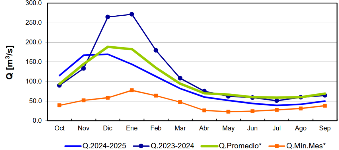 Adicionalmente, para la Región Metropolitana, el pronóstico del río Maipo en El Manzano sitúa los caudales proyectados en Q85% durante primavera, con máximos hacia diciembre–enero acercandose ligeramente al Q50%, para luego presentar una disminución progresiva durante febrero–marzo. Así el caudal proyectado para esta temporada de riego, se encontraría un 38% por debajo del volumen observado en 2024, y un 42% menos que el valor observado promedio.