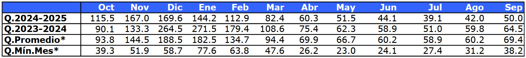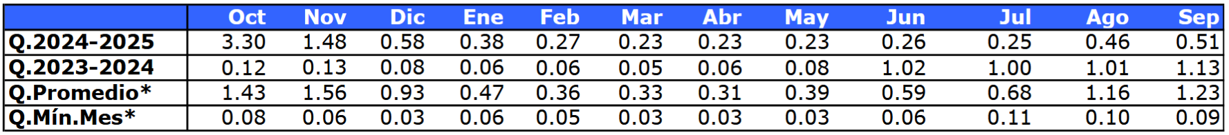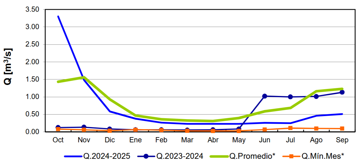 En la estación Río Sobrante en Piñadero, el caudal de septiembre 2025 fue de 0,51 m3/s. Este valor es 58,5% menor al promedio histórico (1,23 m3/s) y 54,9% inferior al registro de septiembre 2024 (1,13 m3/s). En comparación con agosto 2025 (0,46 m3/s), se observa un aumento de 10,9%.