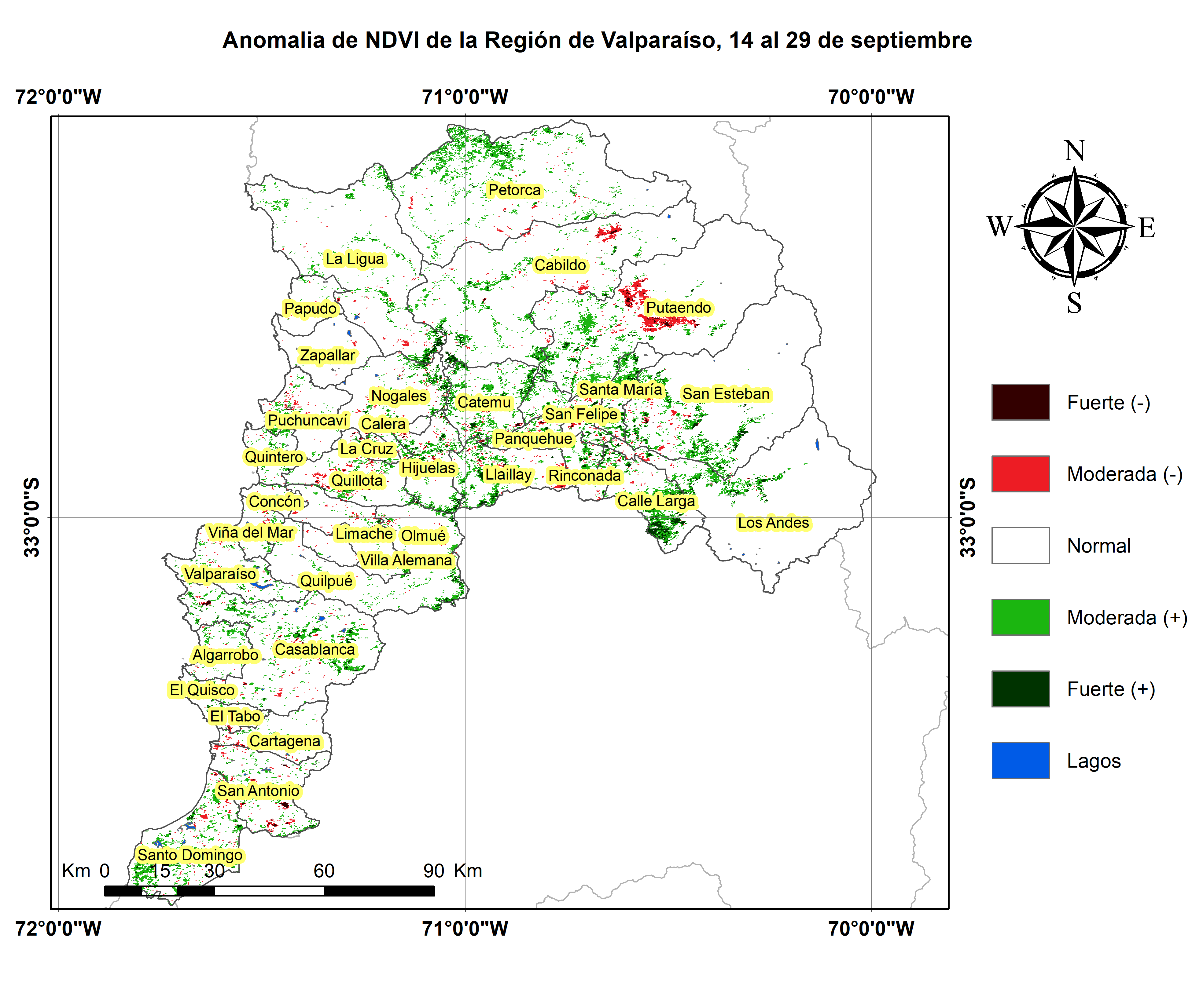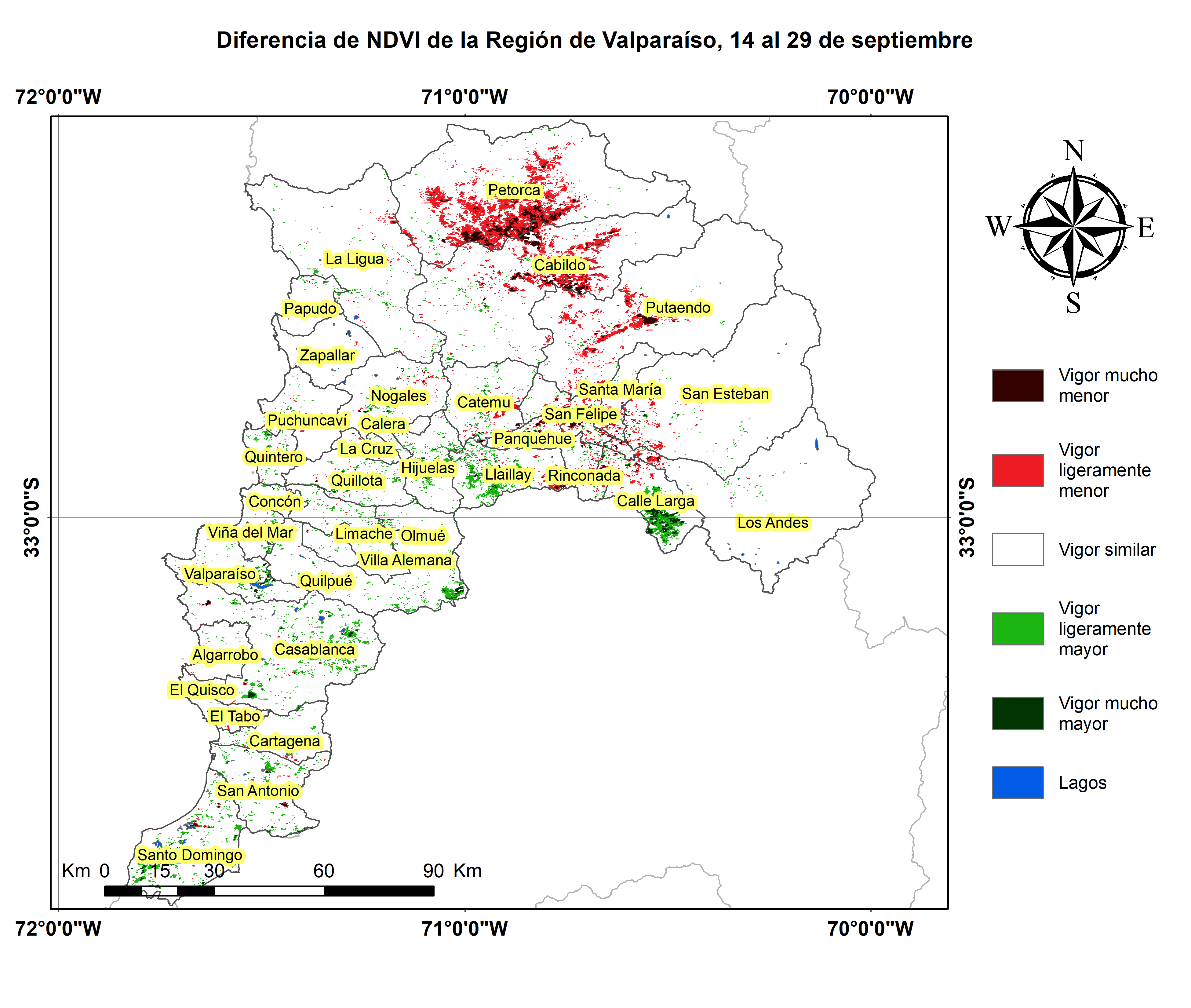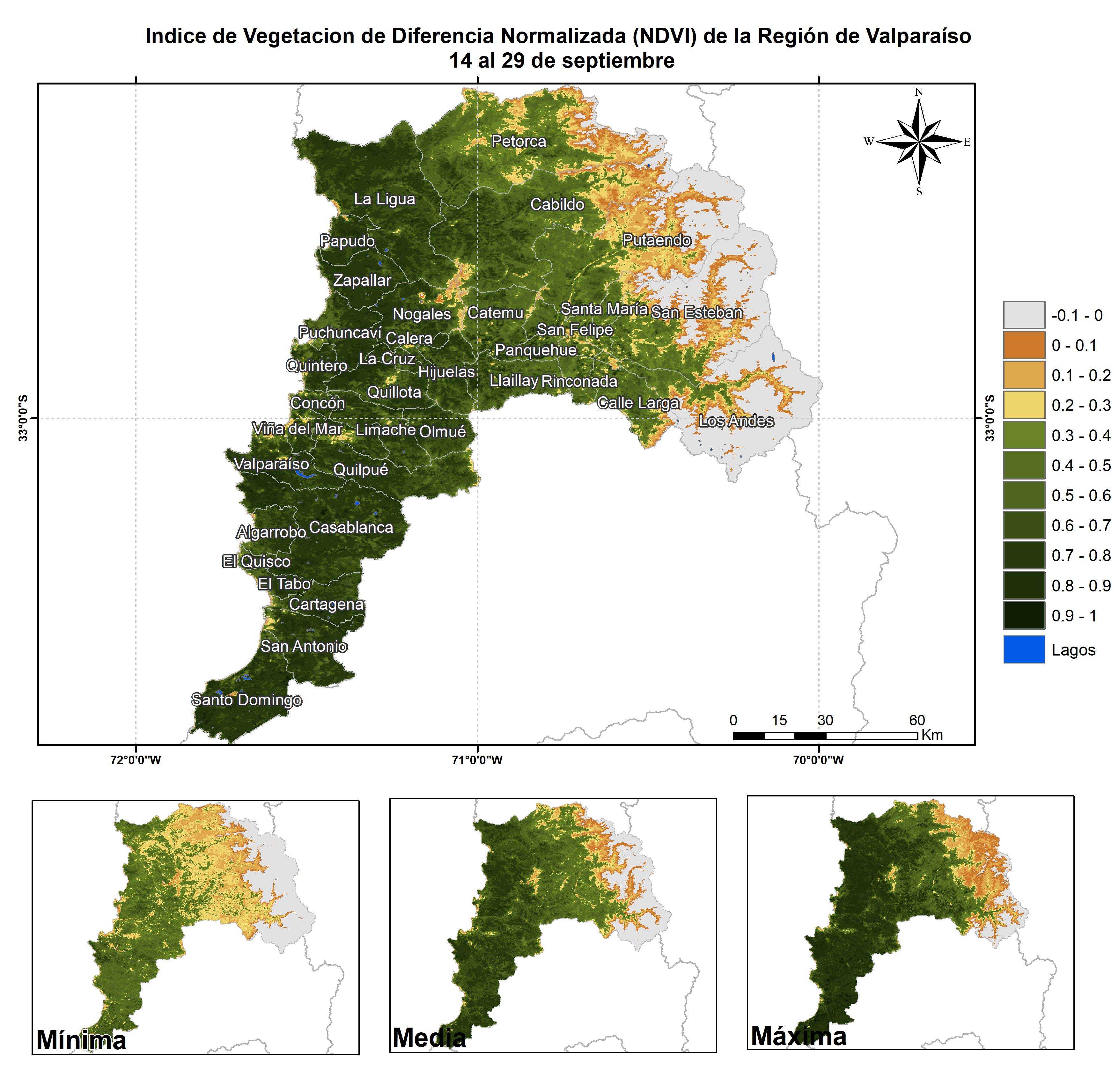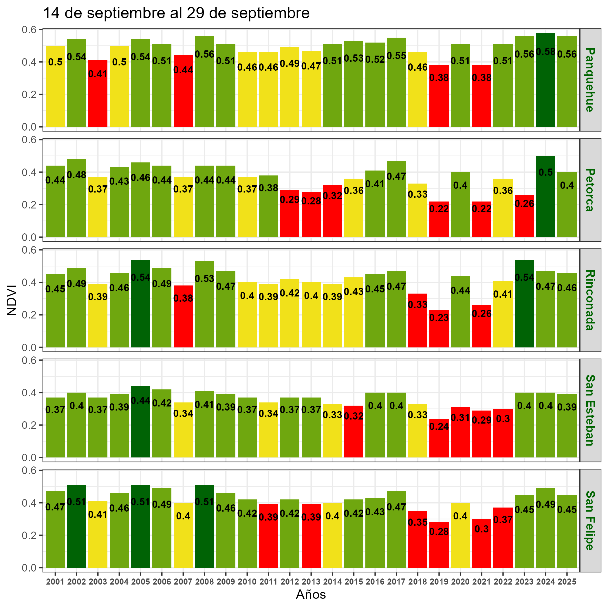 Respecto de la respuesta fisiológica de las plantas al efecto del clima, las imágenes satelitales reflejan la magnitud del crecimiento o disminución de la cobertura vegetal en esta época del año mediante el índice de vegetación NDVI (Desviación Normalizada del Índice de Vegetación).