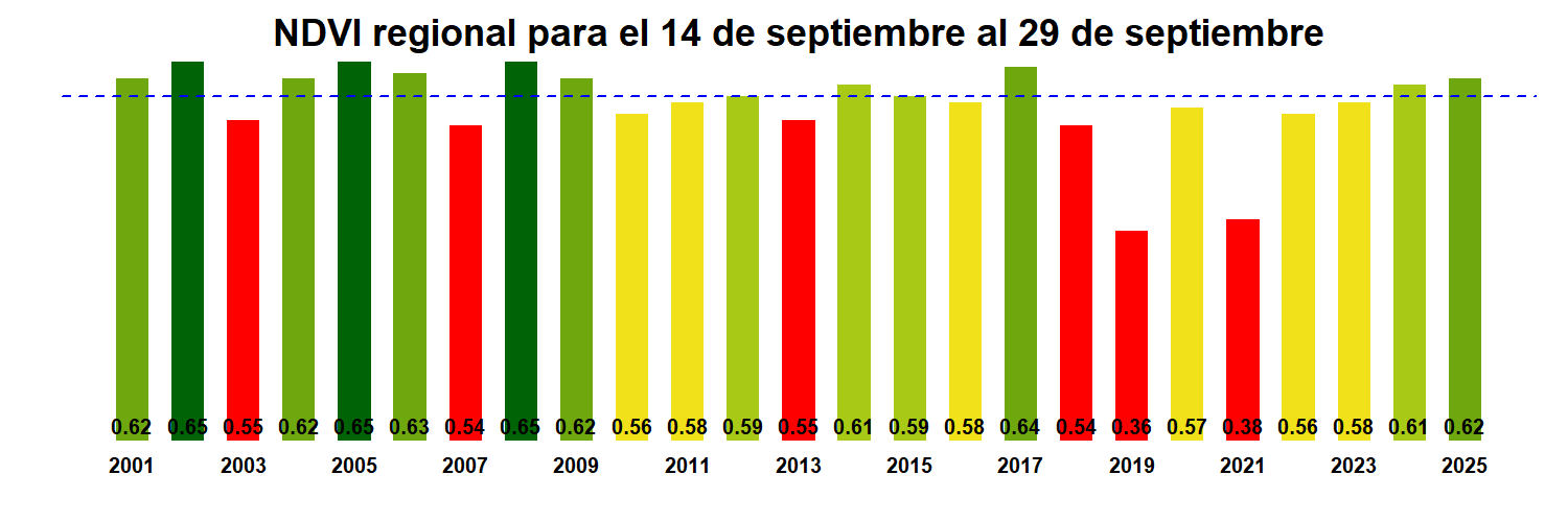 Para esta quincena se observa un NDVI promedio regional de 0.62 mientras el año pasado había sido de 0.61. El valor promedio histórico para esta región, en este período del año es de 0.58.