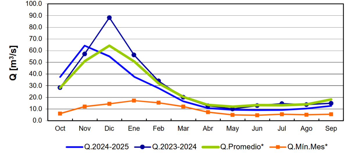 De esta forma, el pronóstico de caudales de deshielo para la cuenca del Aconcagua en Chacabuquito se ubica en torno al Q50% entre septiembre y enero, con descensos hacia fines de verano, llegando a valores Q85%. Esto significaría un 32% menos agua en comparación con el año 2024 y un 42% por debajo del promedio (1991 - 2020).