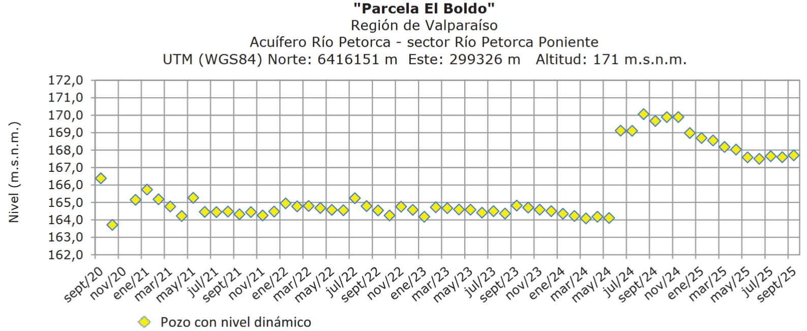 En el sector Río Petorca Poniente, correspondiente al acuífero Río Petorca, el pozo Parcela El Boldo mantiene una tendencia descendente en el último semestre. En agosto 2025 registró un nivel en torno a 168 m.s.n.m., equivalente a 3 m bajo la superficie, lo que refleja una disminución sostenida tras el alza registrada a finales de 2024, pero presentando un nivel estabilizado en los últimos 5 meses.