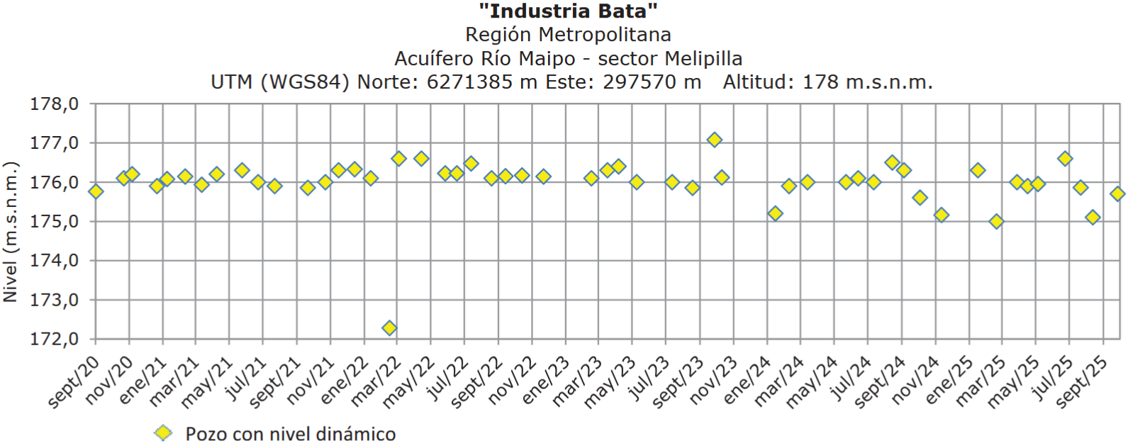 En el pozo Industria Bata, del acuífero Río Maipo (Melipilla), el nivel dinámico se mantiene relativamente estable respecto al comportamiento de los últimos años, situándose en agosto 2025 en torno a los 176 m.s.n.m., lo que corresponde a 2 m bajo la superficie del pozo.