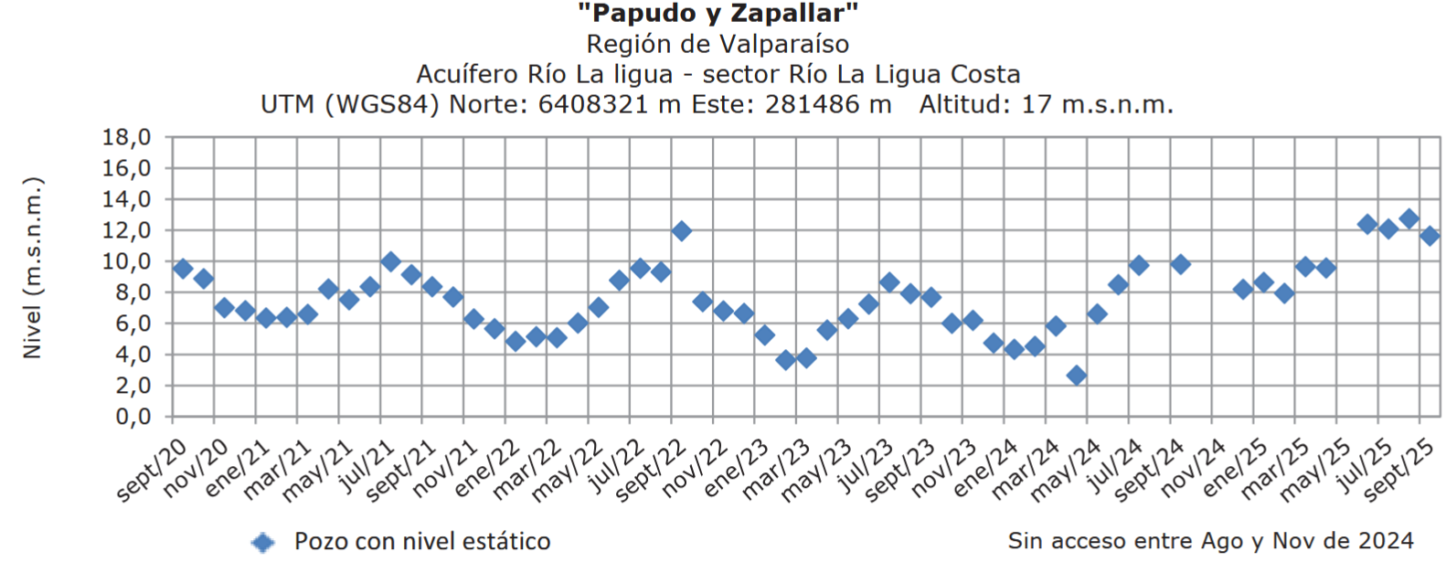 En el sector Río La Ligua Costa, pozo Papudo y Zapallar presentó en agosto 2025 su nivel más alto desde 2020, alcanzando 12 m.s.n.m., tras la recuperación registrada en los últimos meses.