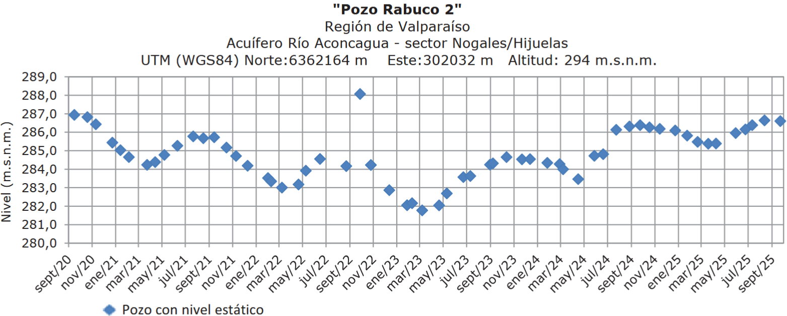 En el acuífero Río Aconcagua en el sector de Nogales/Hijuelas, el nivel estático del Pozo Rabuco 2 muestra una recuperación sostenida en el último año. Durante agosto 2025 el nivel se ubicó en torno a 287 m.s.n.m., lo que equivale a cerca de 7 m desde la superficie del pozo, sin grandes variaciones en comparación con el mes anterior.