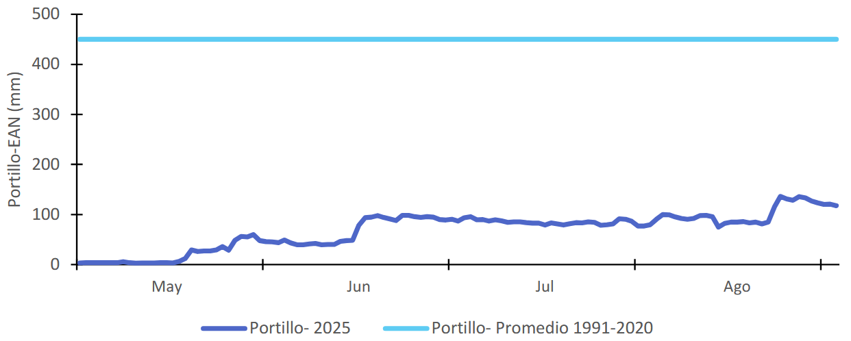 Respecto del manto nival, la serie de Portillo (Aconcagua) muestra que el Equivalente de Agua Nieve (EAN) 2025 se mantuvo muy por debajo del promedio 1991–2020 a lo largo del período de acumulación, llegando a un valor acumulado para el periodo 2025 de 325 mm, presentando un déficit del 28% en relación al valor promedio y un 38% inferior al año anterior.