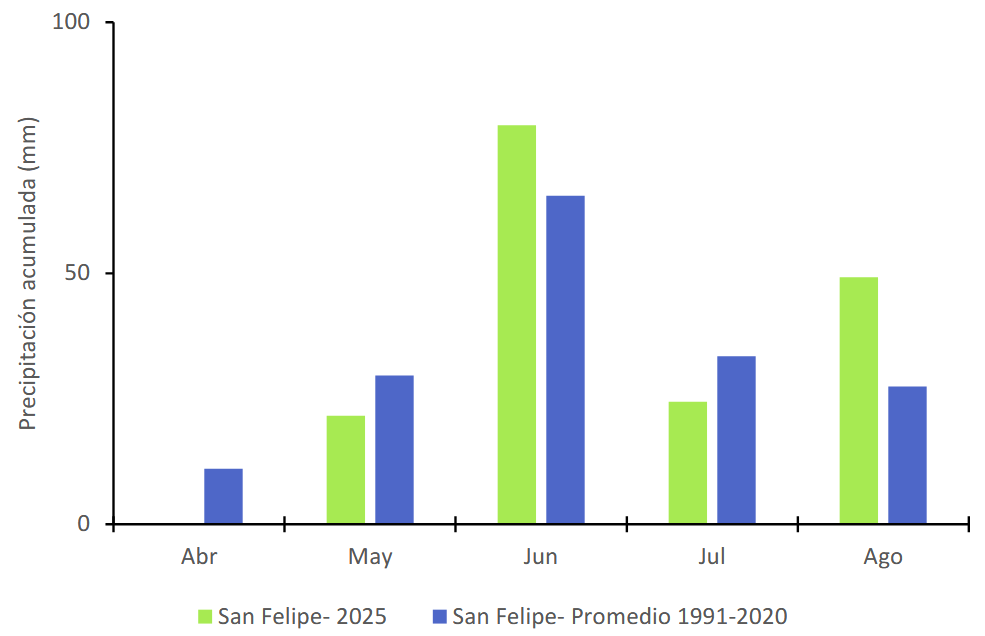 Al analizar el comportamiento de la precipitación acumulada mensual entre abril y agosto de 2025 para la estación de San Felipe, se observa que junio y agosto registran valores por sobre el promedio 1991-2020, mientras que abril y julio se ubican por debajo del promedio y mayo levemente bajo la referencia climatológica.