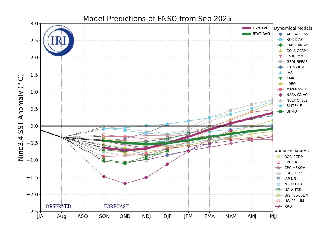 Figura 2. Evolución de Modelos de predicción del comportamiento del fenómeno ENSO representando la probabilidad de ocurrencia de La Niña en la mitad inferior del gráfico, y la de El Niño en la mitad superior del gráfico. Los registros en el rango entre -0.5 y +0.5 representan un pronóstico d condiciones neutras, y los registros sobre 0.5 indican el probable desarrollo del fenómeno del Niño.