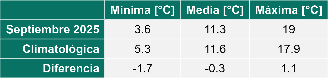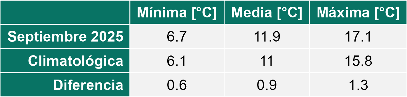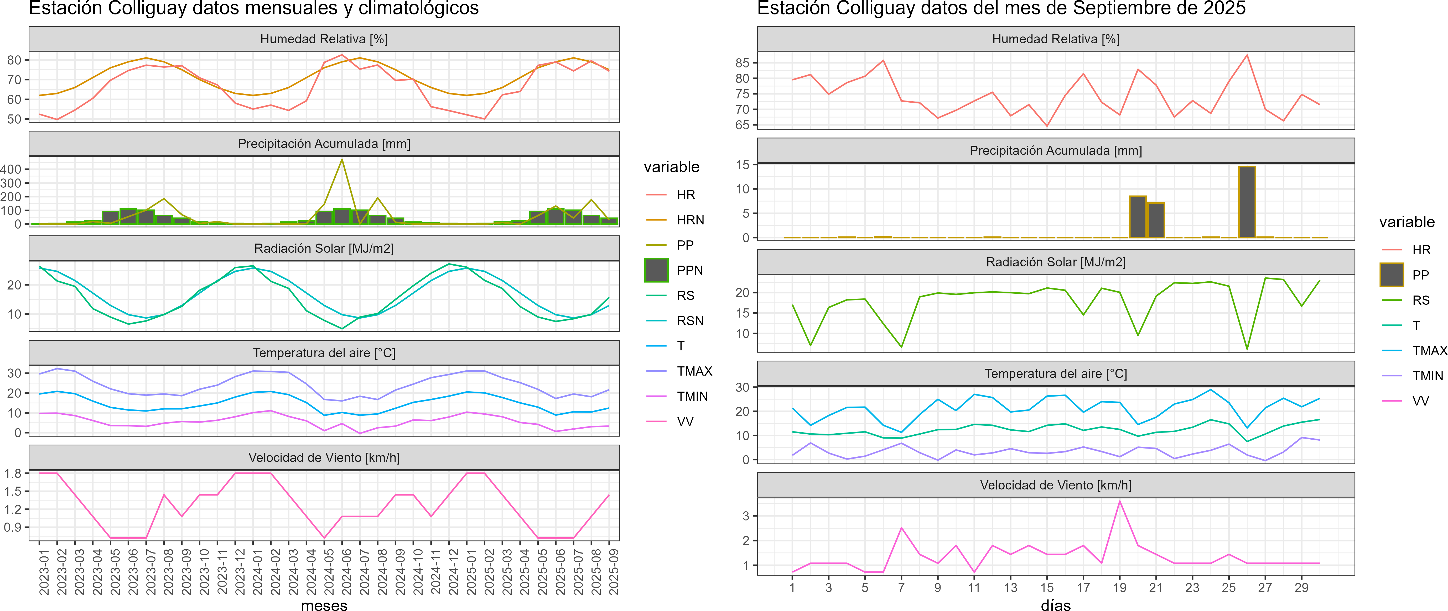 La estación Colliguay corresponde al distrito agroclimático 5-6-2. Para este distrito climático la temperatura mínima, media y máxima climatológicas alcanzan los 4.7°C, 11.5°C y 18.2°C respectivamente. Por su parte, respecto a las temperaturas medidas durante el mes de septiembre en la estación: la temperatura mínima alcanzo los 3.4°C (-1.3°C bajo la climatológica), la temperatura media 12.3°C (0.8°C sobre la climatológica) y la temperatura máxima llegó a los 21.3°C (3.1°C sobre la climatológica). En el mes de septiembre se registró una pluviometría de 30.8 mm, lo cual representa un 99.4% con respecto al mismo mes de un año normal. De enero a septiembre se ha registrado un total acumulado de 458.4 mm, en circunstancias que un año normal registraría a la fecha 393 mm, lo que representa un superávit de 16.6%. A la misma fecha, durante el año 2024 la precipitación alcanzaba los 13.4 mm.