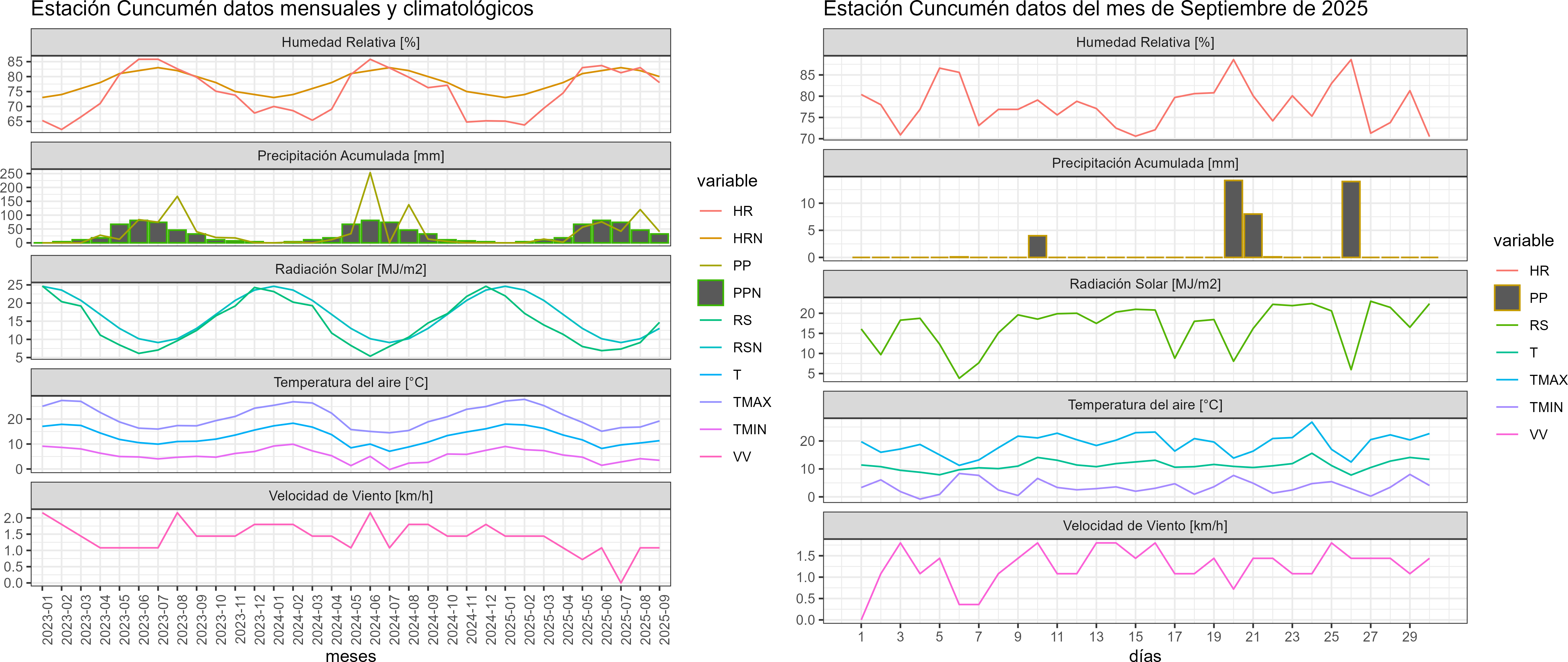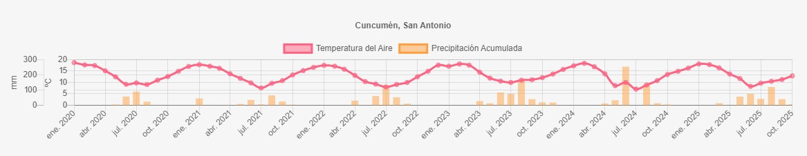 La estación Cuncumén corresponde al distrito agroclimático 5-13-1. Para este distrito climático la temperatura mínima, media y máxima climatológicas alcanzan los 5.3°C, 11.6°C y 17.9°C respectivamente. Por su parte, respecto a las temperaturas medidas durante el mes de septiembre en la estación: la temperatura mínima alcanzo los 3.6°C (-1.7°C bajo la climatológica), la temperatura media 11.3°C (-0.3°C bajo la climatológica) y la temperatura máxima llegó a los 19°C (1.1°C sobre la climatológica). En el mes de septiembre se registró una pluviometría de 40.4 mm, lo cual representa un 115.4% con respecto al mismo mes de un año normal. De enero a septiembre se ha registrado un total acumulado de 350.4 mm, en circunstancias que un año normal registraría a la fecha 448 mm, lo que representa un déficit de 21.8%. A la misma fecha, durante el año 2024 la precipitación alcanzaba los 13.4 mm.
