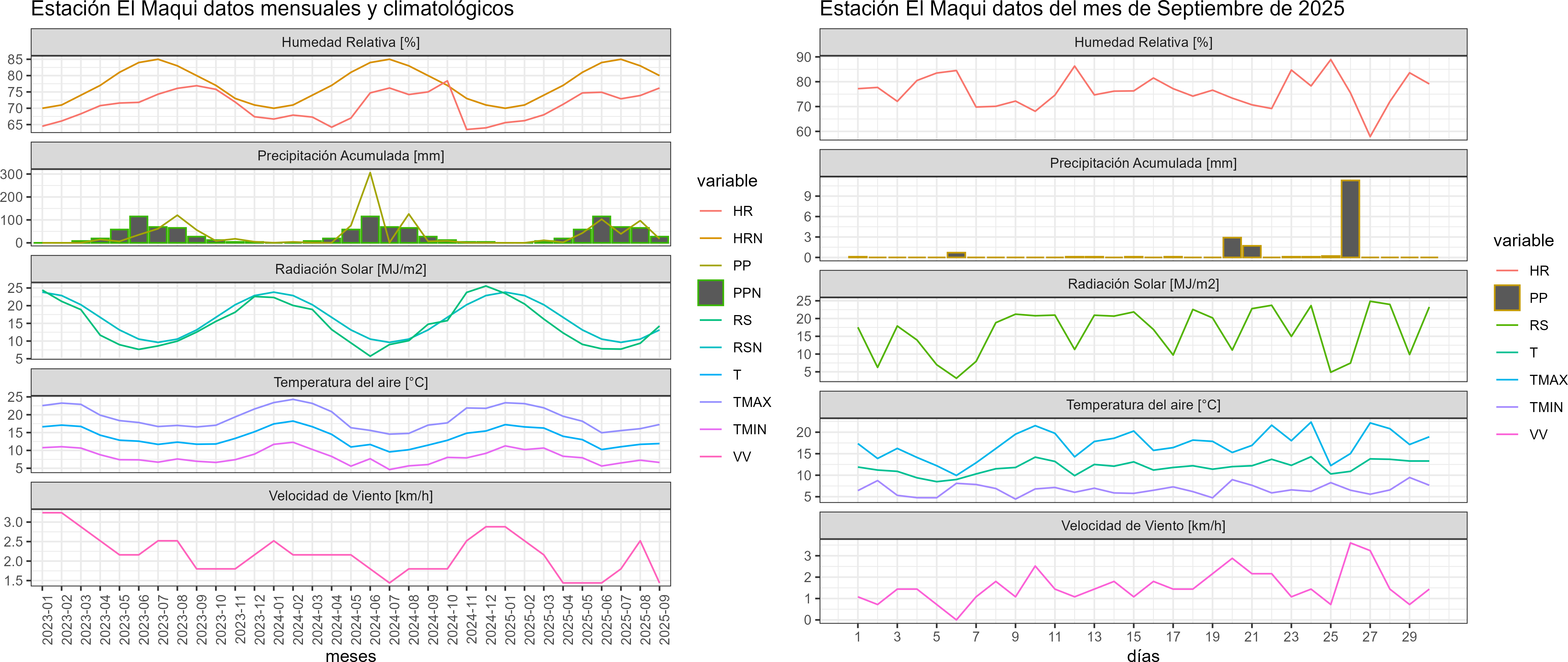 La estación El Maqui corresponde al distrito agroclimático 5-4. Para este distrito climático la temperatura mínima, media y máxima climatológicas alcanzan los 6.1°C, 11°C y 15.8°C respectivamente. Por su parte, respecto a las temperaturas medidas durante el mes de septiembre en la estación: la temperatura mínima alcanzo los 6.7°C (0.6°C sobre la climatológica), la temperatura media 11.9°C (0.9°C sobre la climatológica) y la temperatura máxima llegó a los 17.1°C (1.3°C sobre la climatológica). En el mes de septiembre se registró una pluviometría de 17.5 mm, lo cual representa un 56.5% con respecto al mismo mes de un año normal. De enero a septiembre se ha registrado un total acumulado de 312.5 mm, en circunstancias que un año normal registraría a la fecha 370 mm, lo que representa un déficit de 15.5%. A la misma fecha, durante el año 2024 la precipitación alcanzaba los 6.6 mm.