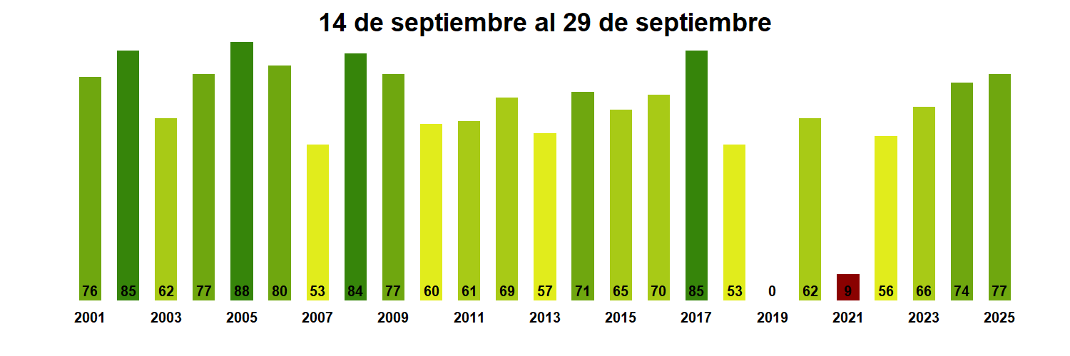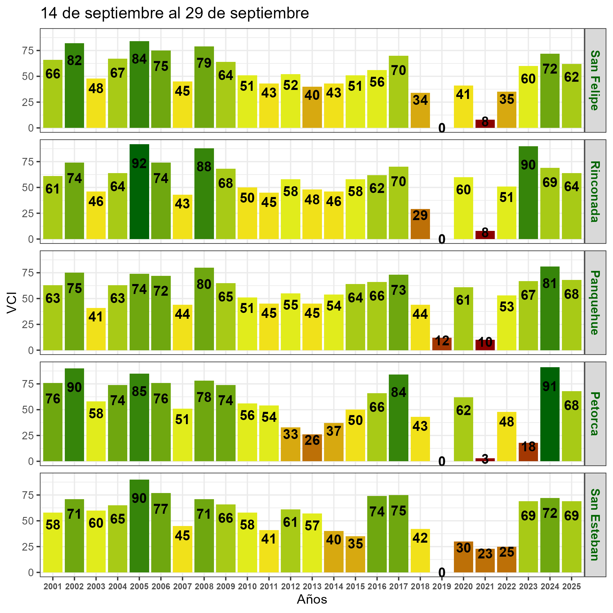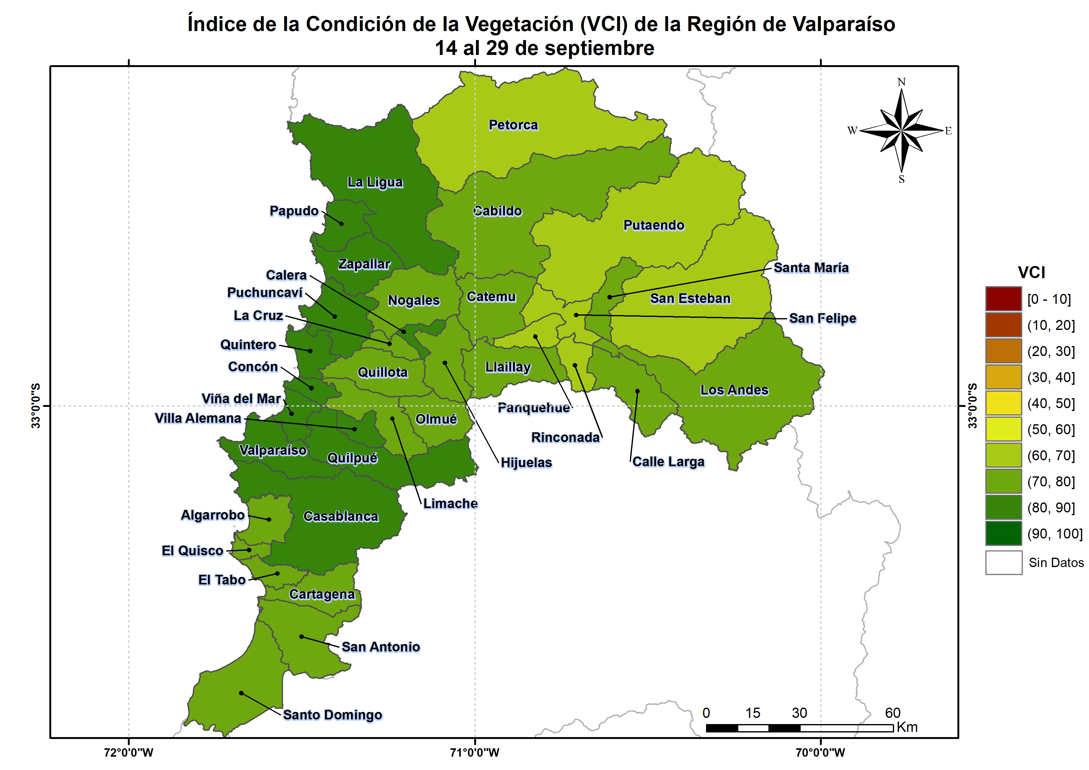 En términos globales la Región presentó un valor mediano de VCI de 77% para el período comprendido desde el 14 al 29 de septiembre. A igual período del año pasado presentaba un VCI de 74% (Fig. 1). De acuerdo a la Tabla 1 la Región de Valparaíso, en términos globales presenta una condición Favorable.
