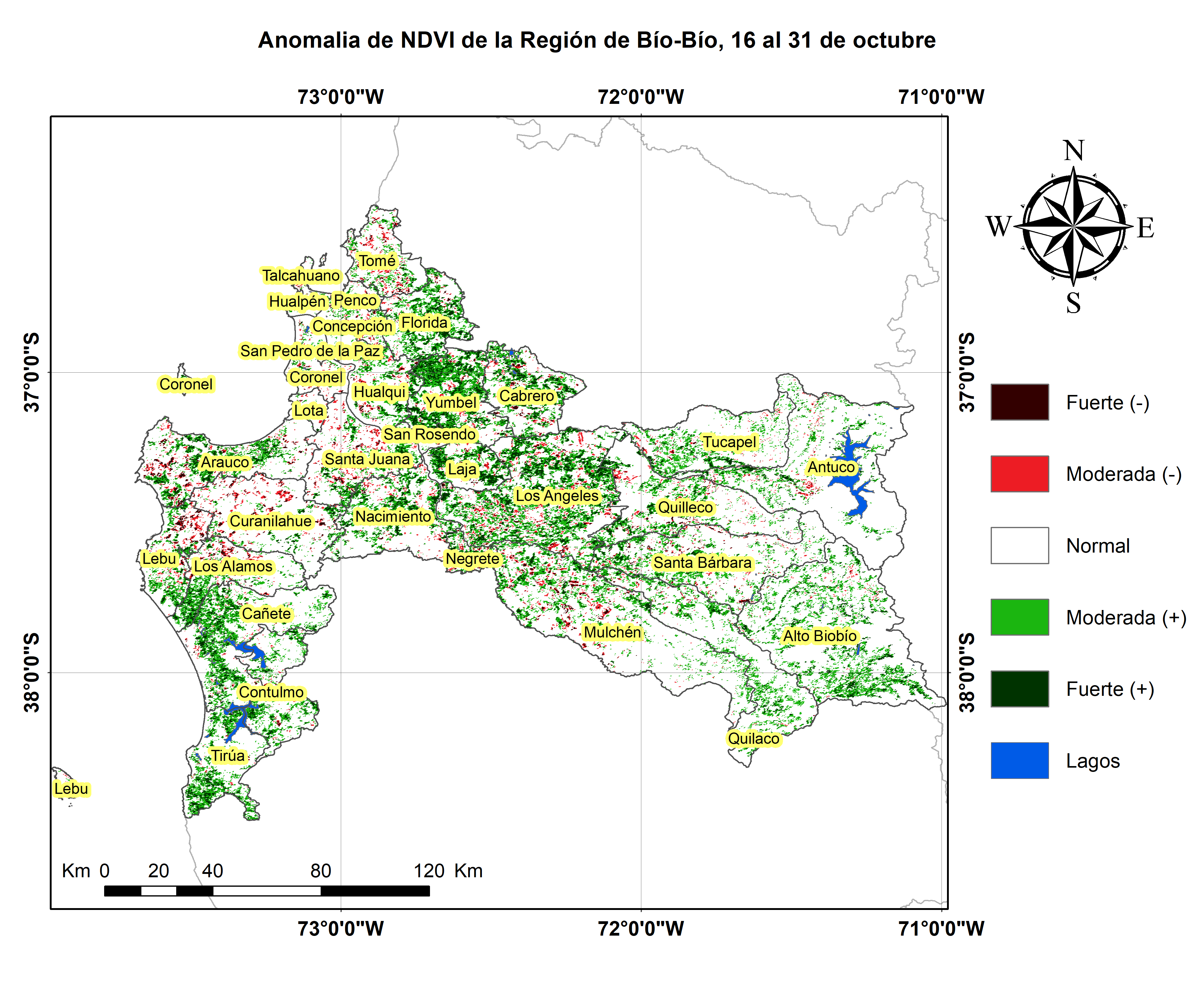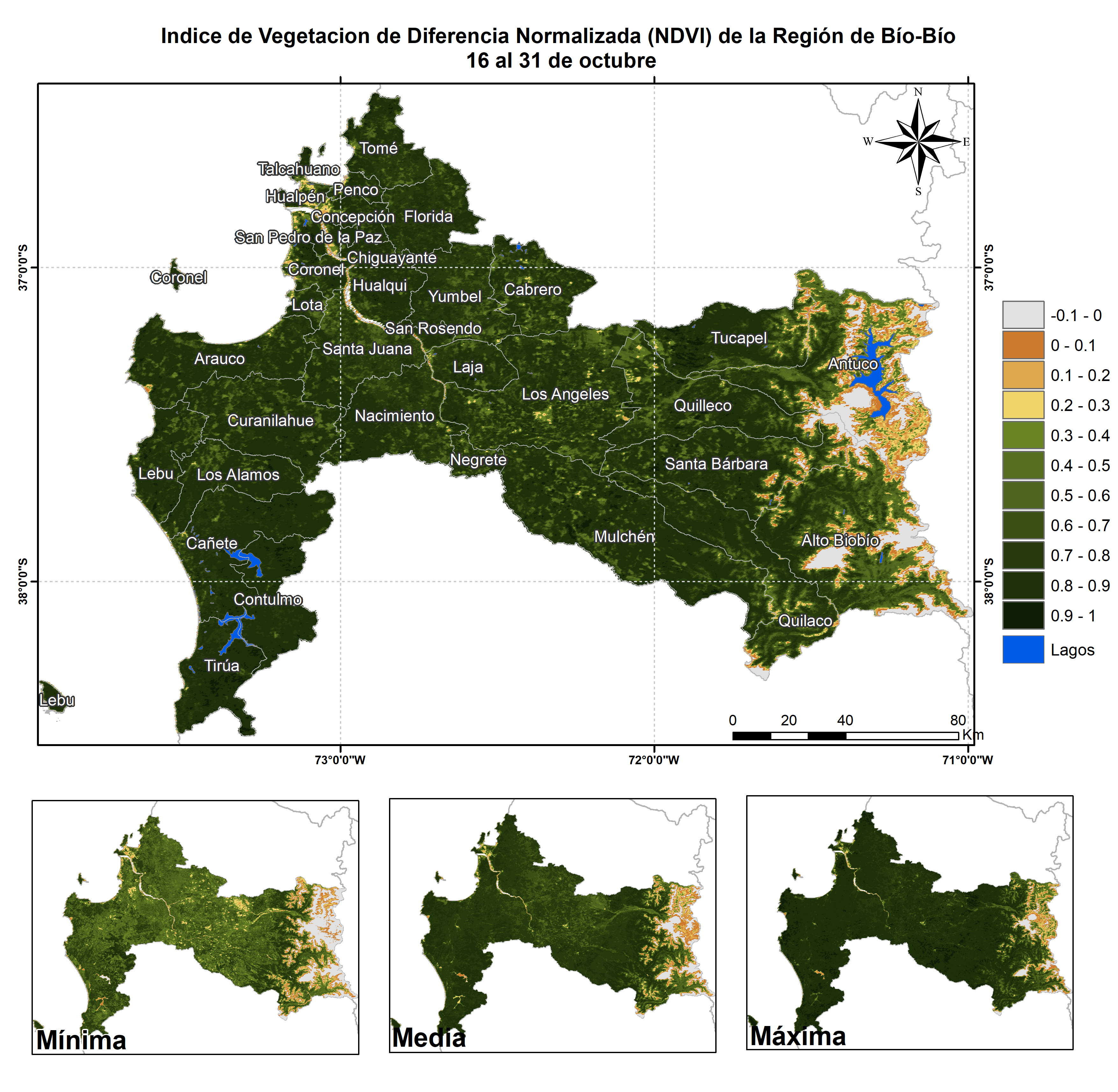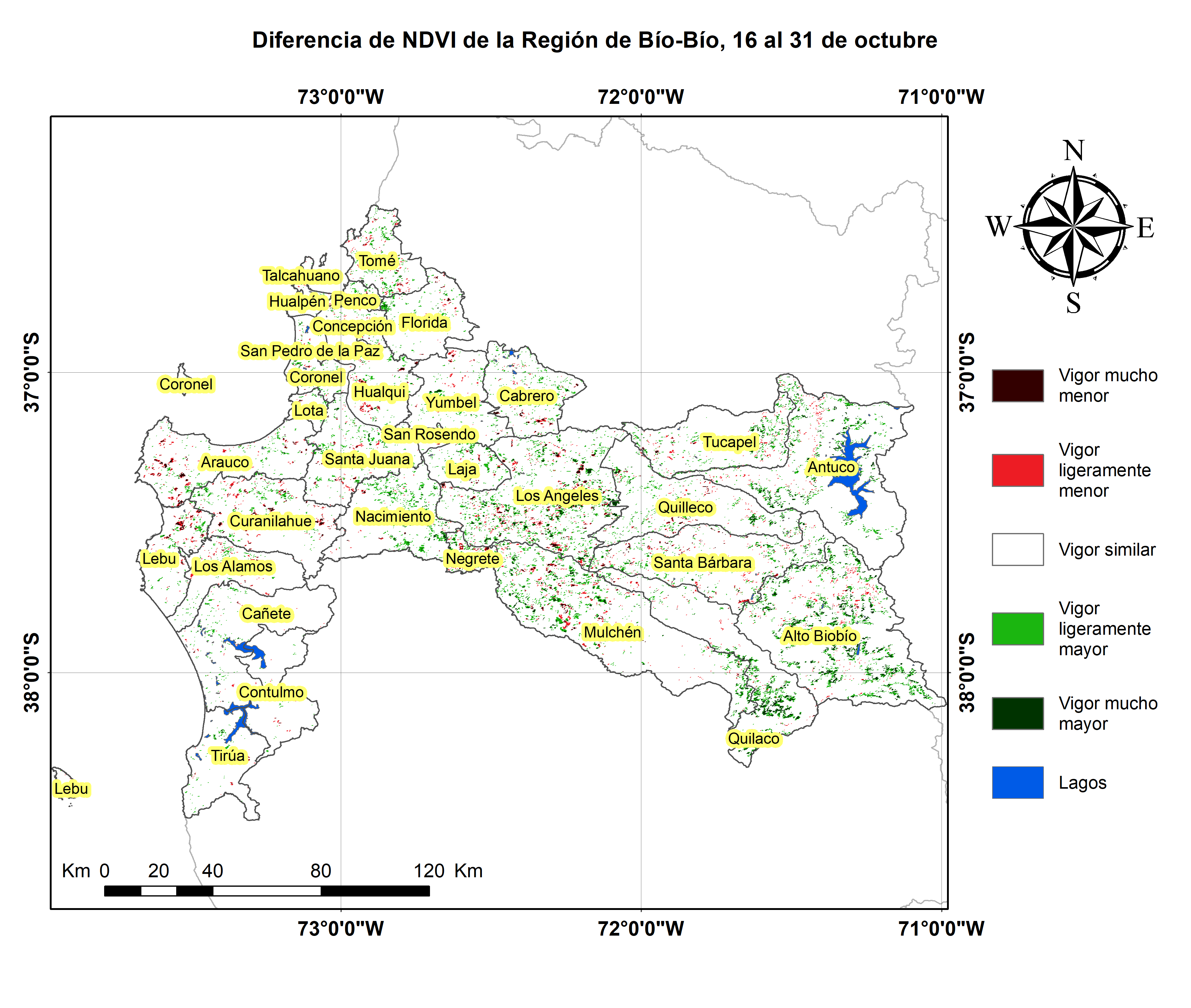 Respecto de la respuesta fisiológica de las plantas al efecto del clima, las imágenes satelitales reflejan la magnitud del crecimiento o disminución de la cobertura vegetal en esta época del año mediante el índice de vegetación NDVI (Desviación Normalizada del Índice de Vegetación).