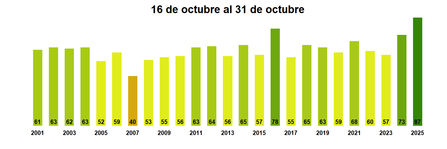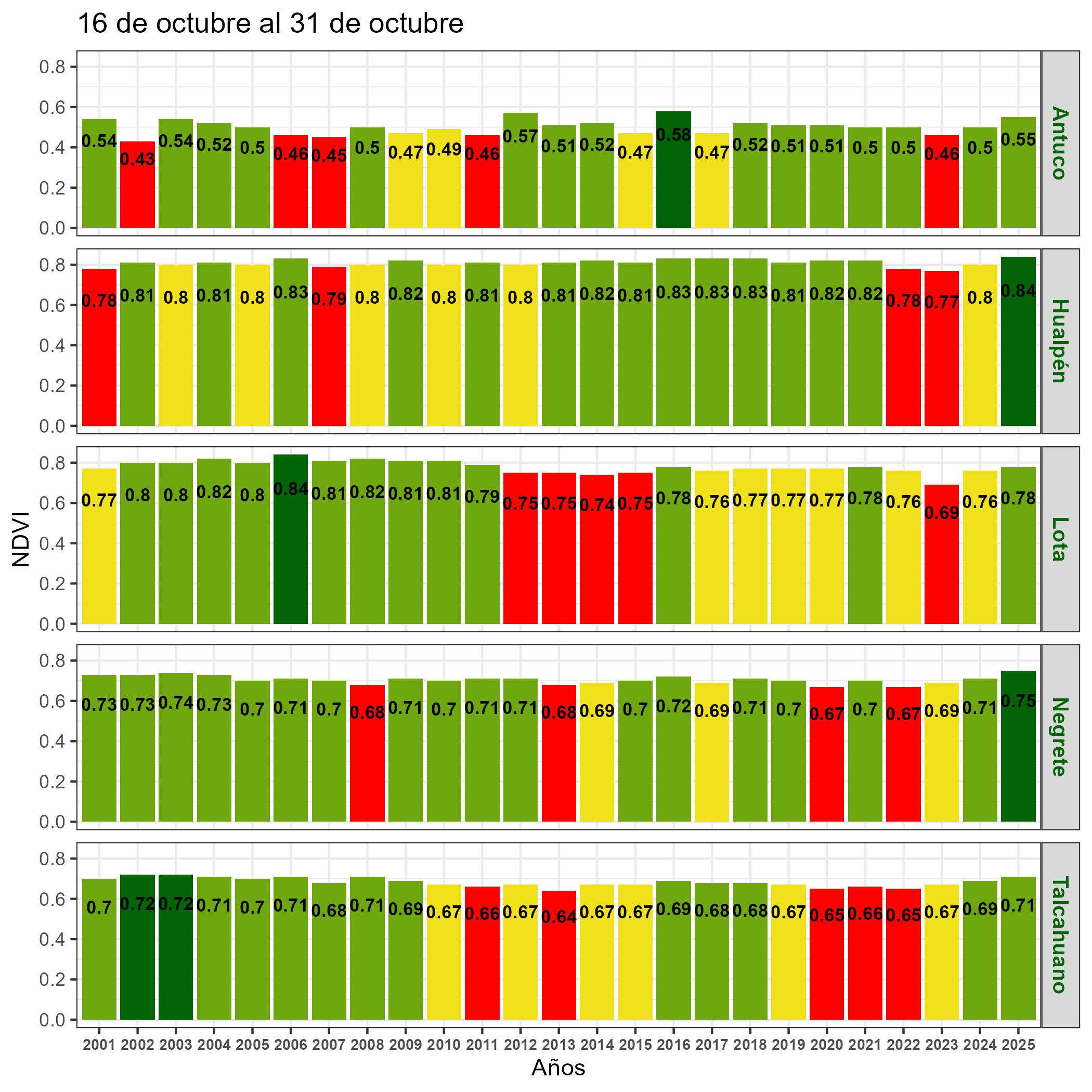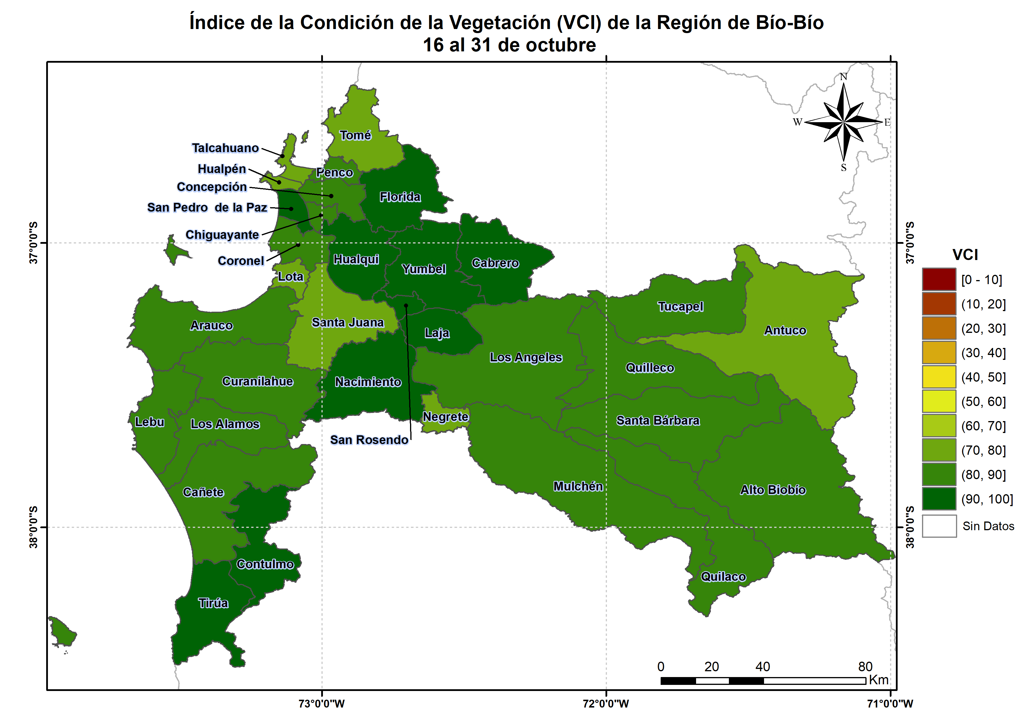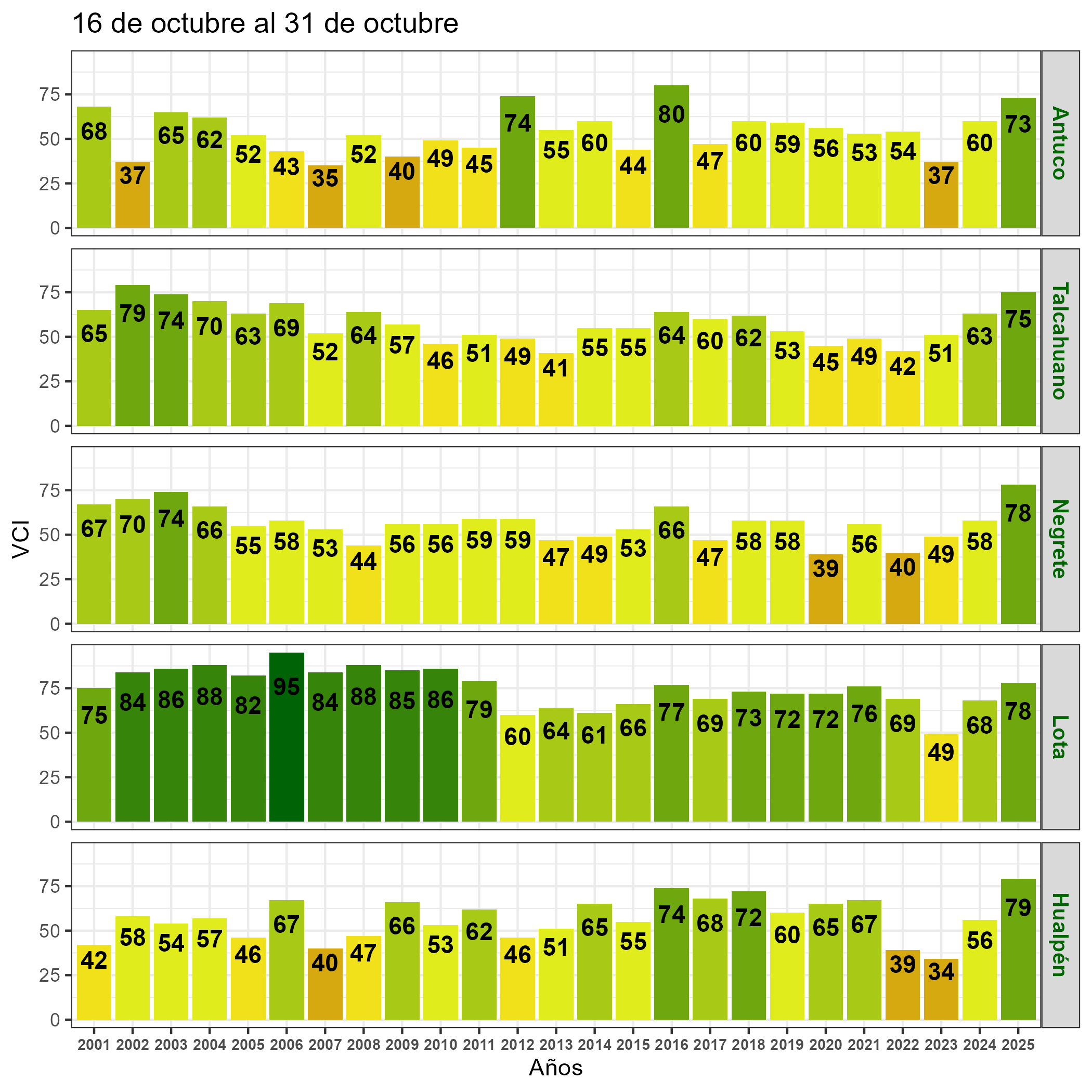 En términos globales la Región presentó un valor mediano de VCI de 87% para el período comprendido desde el 16 al 31 de octubre. A igual período del año pasado presentaba un VCI de 73% (Fig. 1). De acuerdo a la Tabla 1 la Región del Bío Bío, en términos globales presenta una condición Favorable.