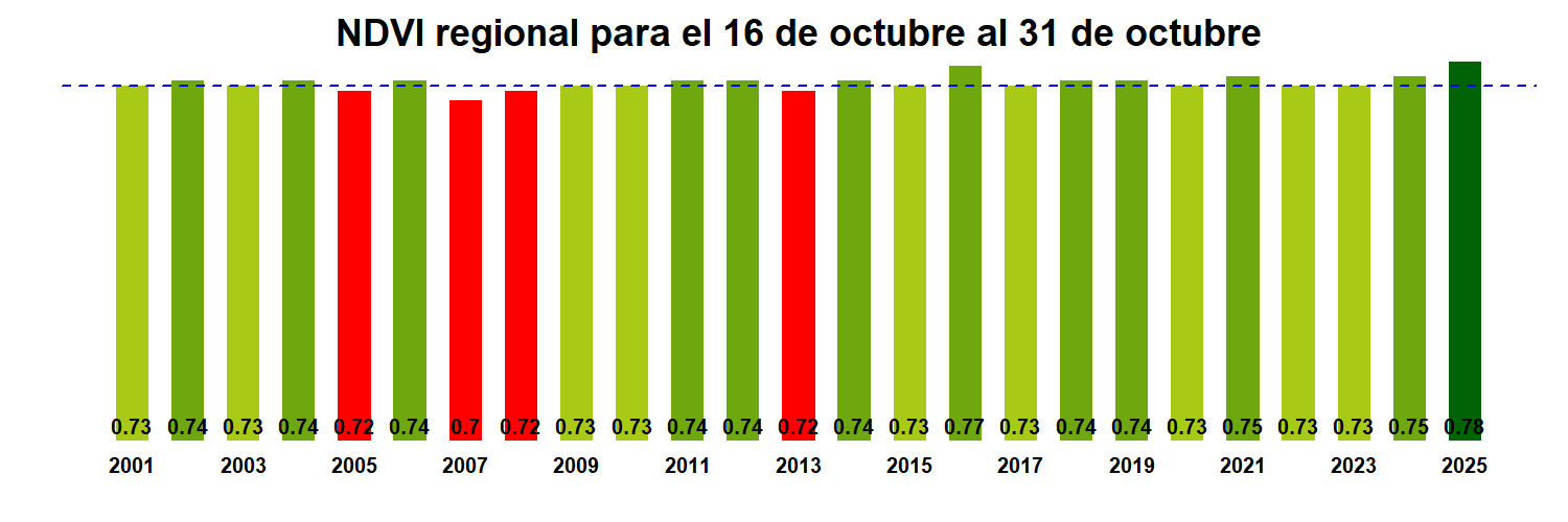 Para esta quincena se observa un NDVI promedio regional de 0.78 mientras el año pasado había sido de 0.75. El valor promedio histórico para esta región, en este período del año es de 0.74.