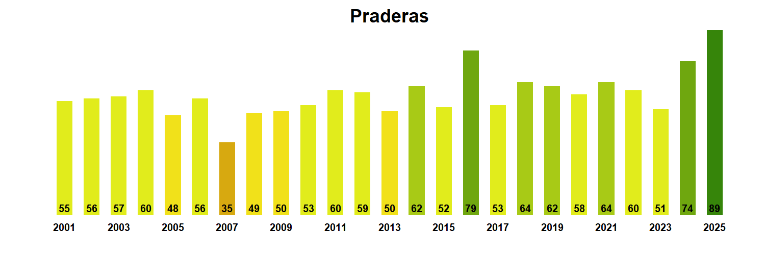Las condiciones climáticas han sido favorables para el crecimiento de las praderas de pastoreo, actualmente se encuentran en plena producción. La temperatura ha sido óptima para las gramíneas (ballica y festuca) y el trébol blanco. La frecuencia de pastoreo debe ser alta, cada 15-20 días, para evitar la espigadura de las gramíneas y no afectar la calidad del forraje y persistencia de la pradera.