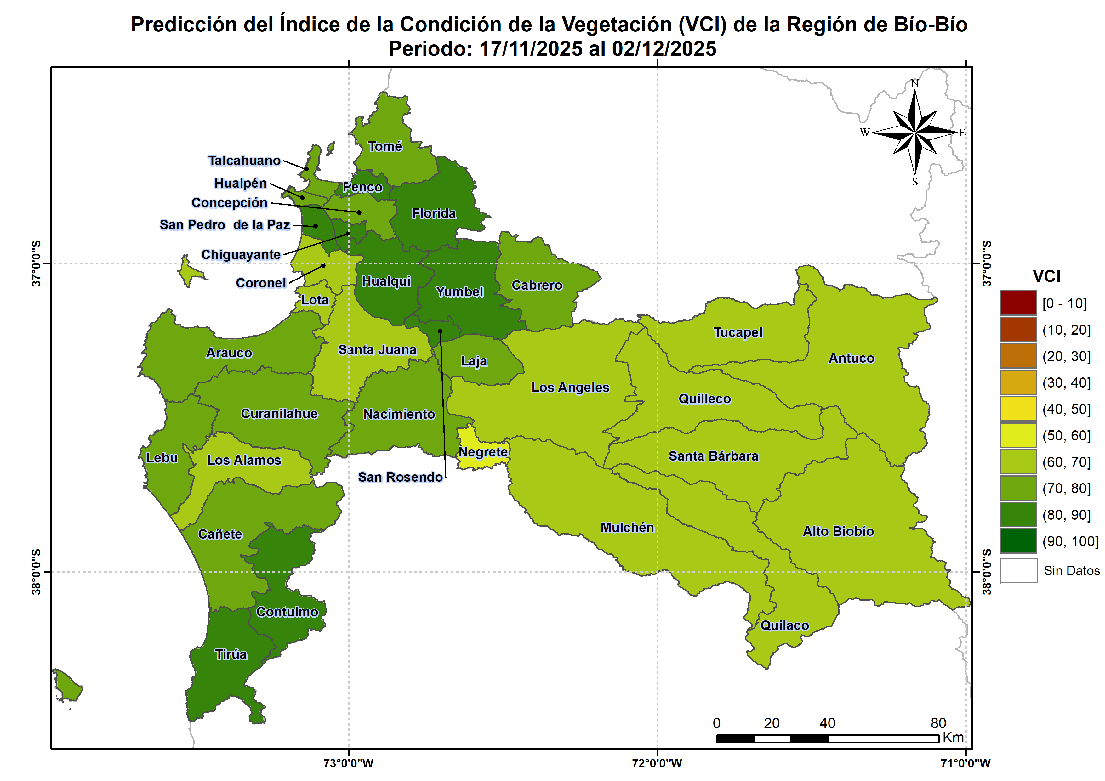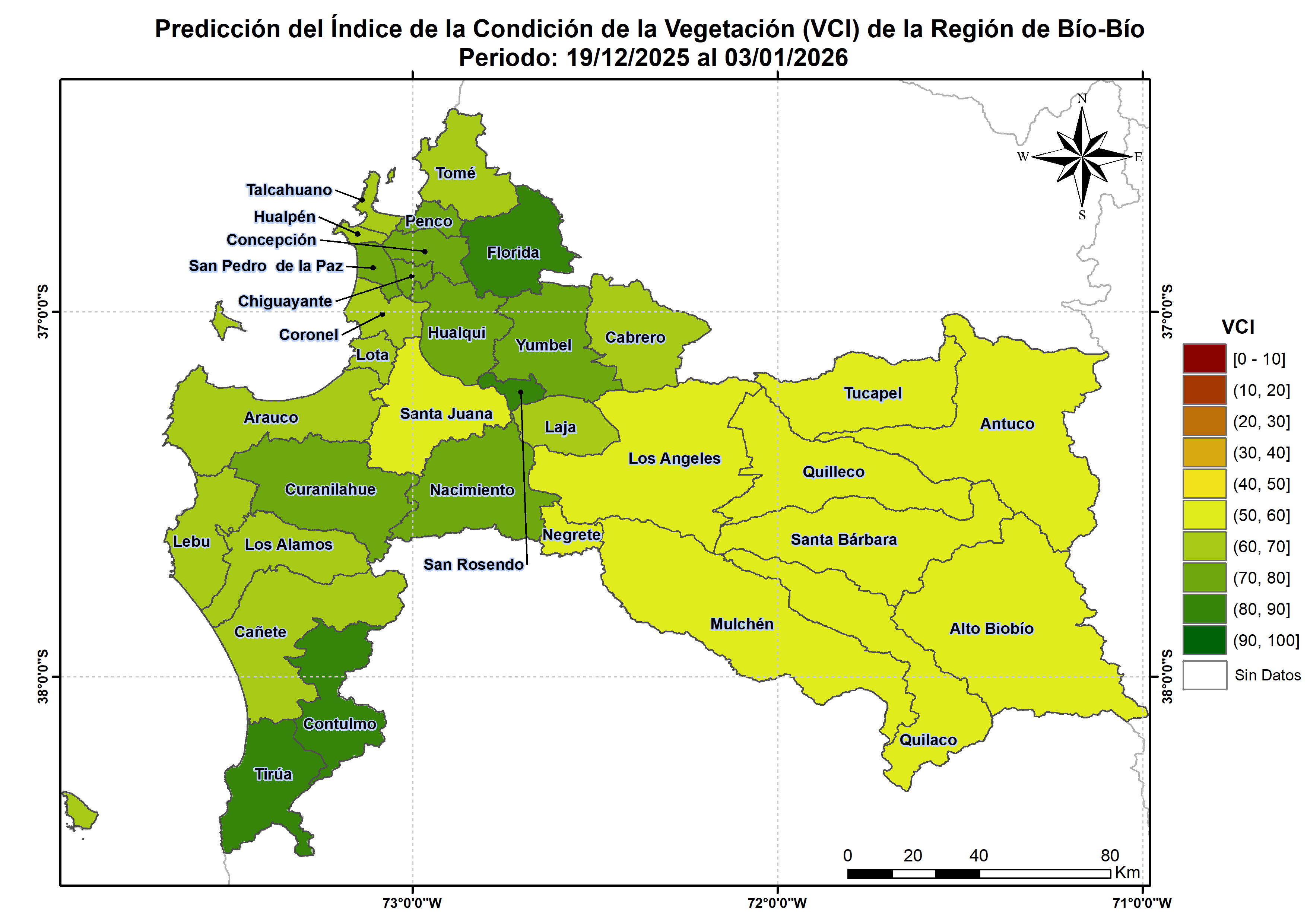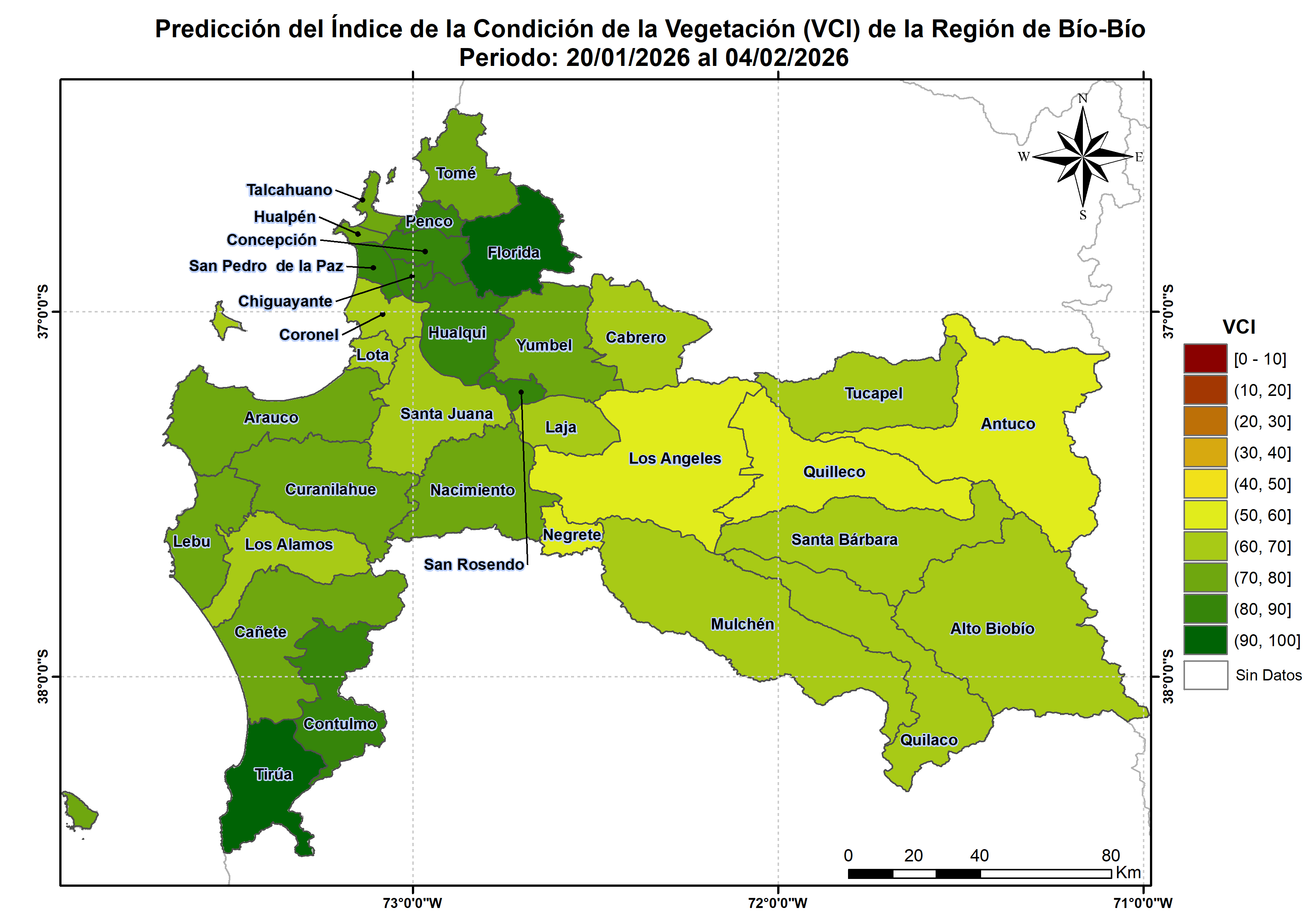 Para el monitoreo del estado de la vegetación en la Región se utilizó el índice de condición de la vegetación, VCI (Kogan, 1990, 1995). Este índice se encuentra entre valores de 0% a 100%. Valores bajo 40% se asocian a una condición desfavorable en la vegetación, siendo 0% la peor condición histórica y 100% la mejor (tabla 1).