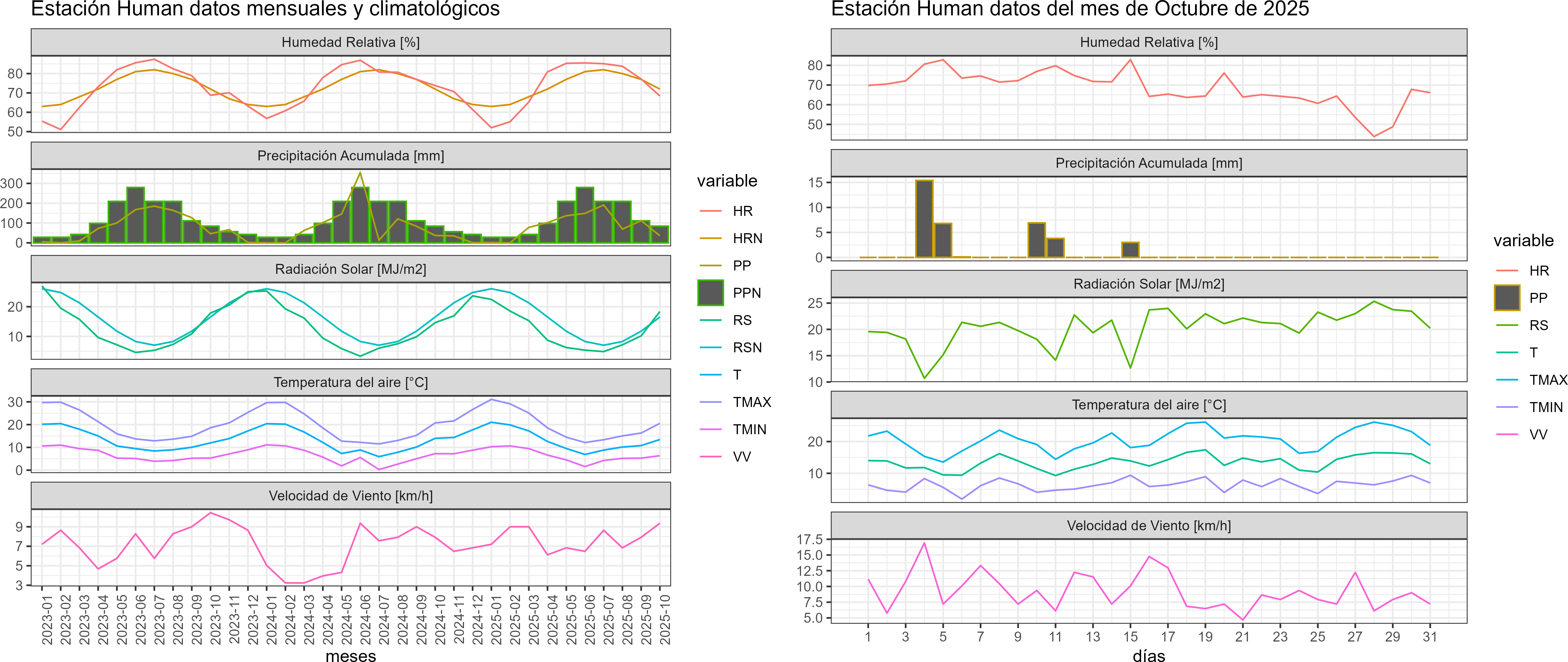 La estación Human corresponde al distrito agroclimático 6-8-1. Para este distrito climático la temperatura mínima, media y máxima climatológicas alcanzan los 5.6°C, 12.7°C y 19.8°C respectivamente. Por su parte, respecto a las temperaturas medidas durante el mes de octubre en la estación: la temperatura mínima alcanzo los 6.3°C (0.7°C sobre la climatológica), la temperatura media 13.4°C (0.7°C sobre la climatológica) y la temperatura máxima llegó a los 20.6°C (0.8°C sobre la climatológica). En el mes de octubre se registró una pluviometría de 36 mm, lo cual representa un 50% con respecto al mismo mes de un año normal. De enero a octubre se ha registrado un total acumulado de 875.5 mm, en circunstancias que un año normal registraría a la fecha 1096 mm, lo que representa un déficit de 20.1%. A la misma fecha, durante el año 2024 la precipitación alcanzaba los 37 mm.