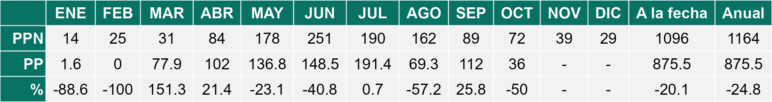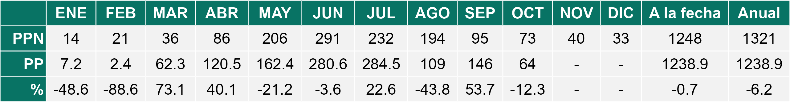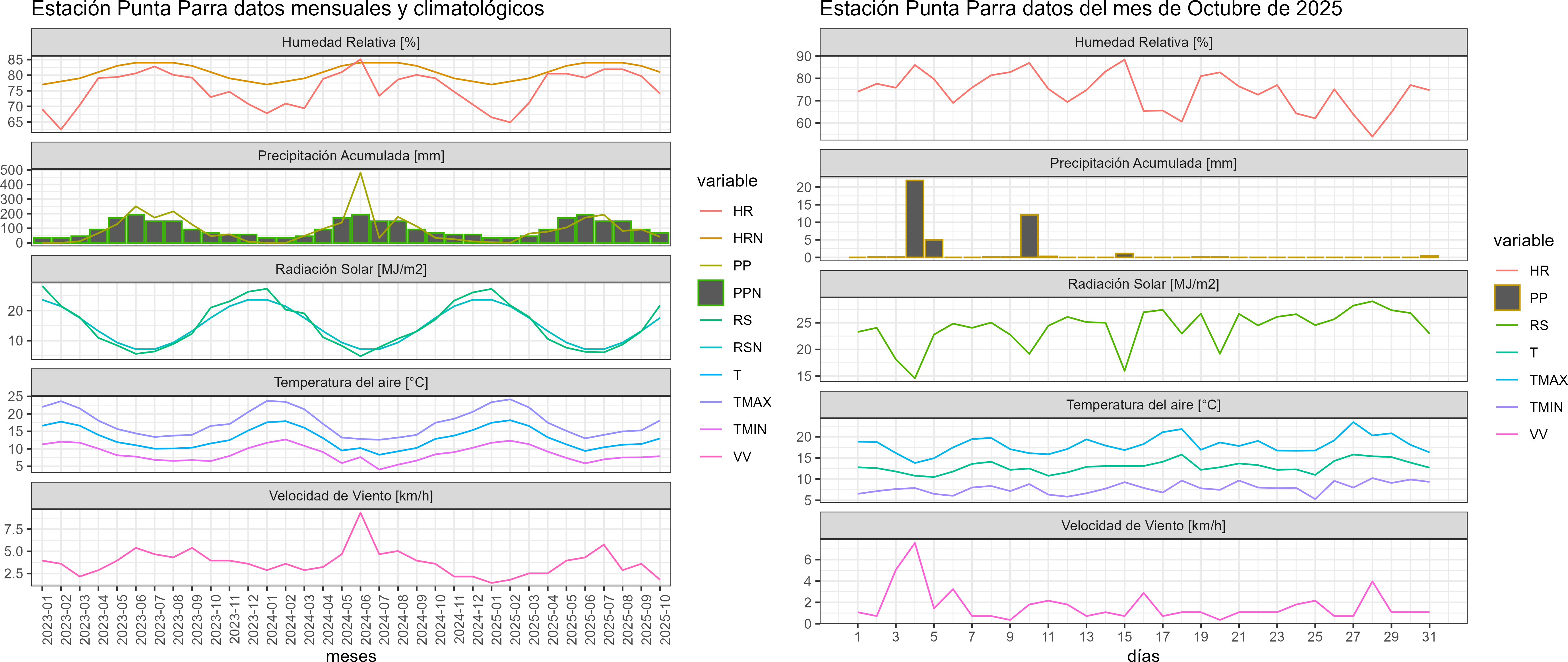 La estación Punta Parra corresponde al distrito agroclimático 8-9-1. Para este distrito climático la temperatura mínima, media y máxima climatológicas alcanzan los 6.8°C, 12.4°C y 18°C respectivamente. Por su parte, respecto a las temperaturas medidas durante el mes de octubre en la estación: la temperatura mínima alcanzo los 7.9°C (1.1°C sobre la climatológica), la temperatura media 13°C (0.6°C sobre la climatológica) y la temperatura máxima llegó a los 18.1°C (0.1°C sobre la climatológica). En el mes de octubre se registró una pluviometría de 41.4 mm, lo cual representa un 81.2% con respecto al mismo mes de un año normal. De enero a octubre se ha registrado un total acumulado de 831.3 mm, en circunstancias que un año normal registraría a la fecha 876 mm, lo que representa un déficit de 5.1%. A la misma fecha, durante el año 2024 la precipitación alcanzaba los 34.1 mm.