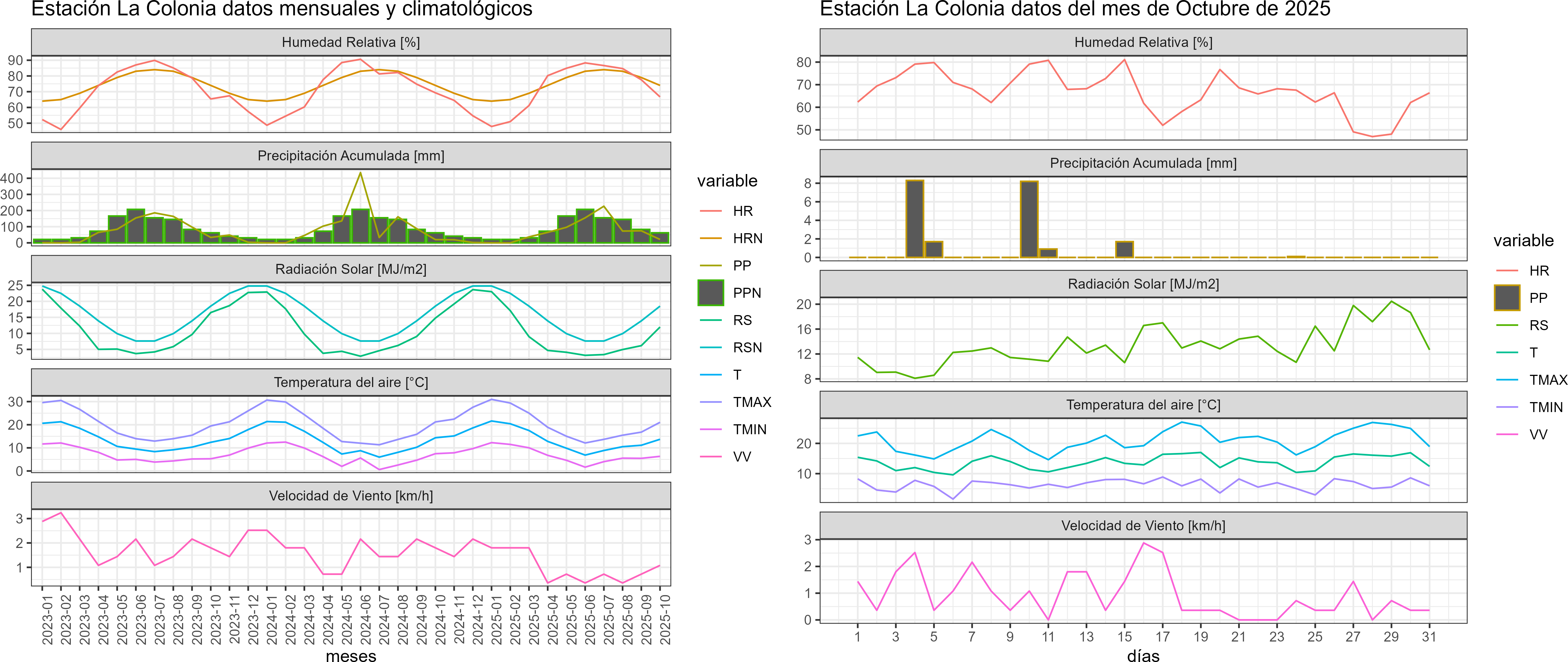 La estación La Colonia corresponde al distrito agroclimático 7-9-1. Para este distrito climático la temperatura mínima, media y máxima climatológicas alcanzan los 6°C, 13°C y 20°C respectivamente. Por su parte, respecto a las temperaturas medidas durante el mes de octubre en la estación: la temperatura mínima alcanzo los 6.3°C (0.3°C sobre la climatológica), la temperatura media 13.7°C (0.7°C sobre la climatológica) y la temperatura máxima llegó a los 21.1°C (1.1°C sobre la climatológica). En el mes de octubre se registró una pluviometría de 20.9 mm, lo cual representa un 35.4% con respecto al mismo mes de un año normal. De enero a octubre se ha registrado un total acumulado de 747.8 mm, en circunstancias que un año normal registraría a la fecha 964 mm, lo que representa un déficit de 22.4%. A la misma fecha, durante el año 2024 la precipitación alcanzaba los 19.9 mm.