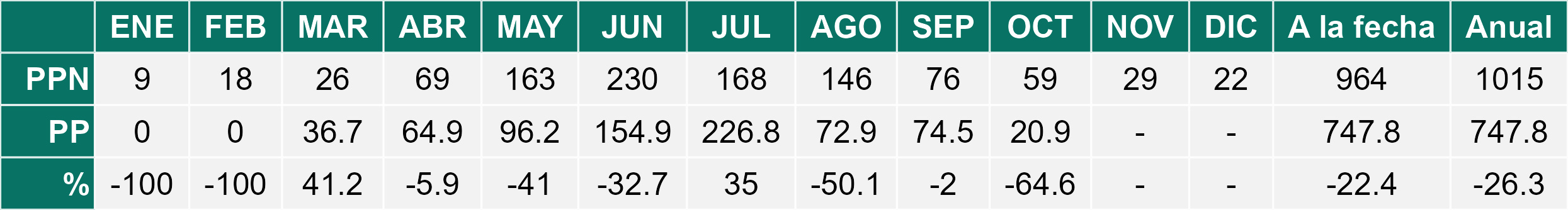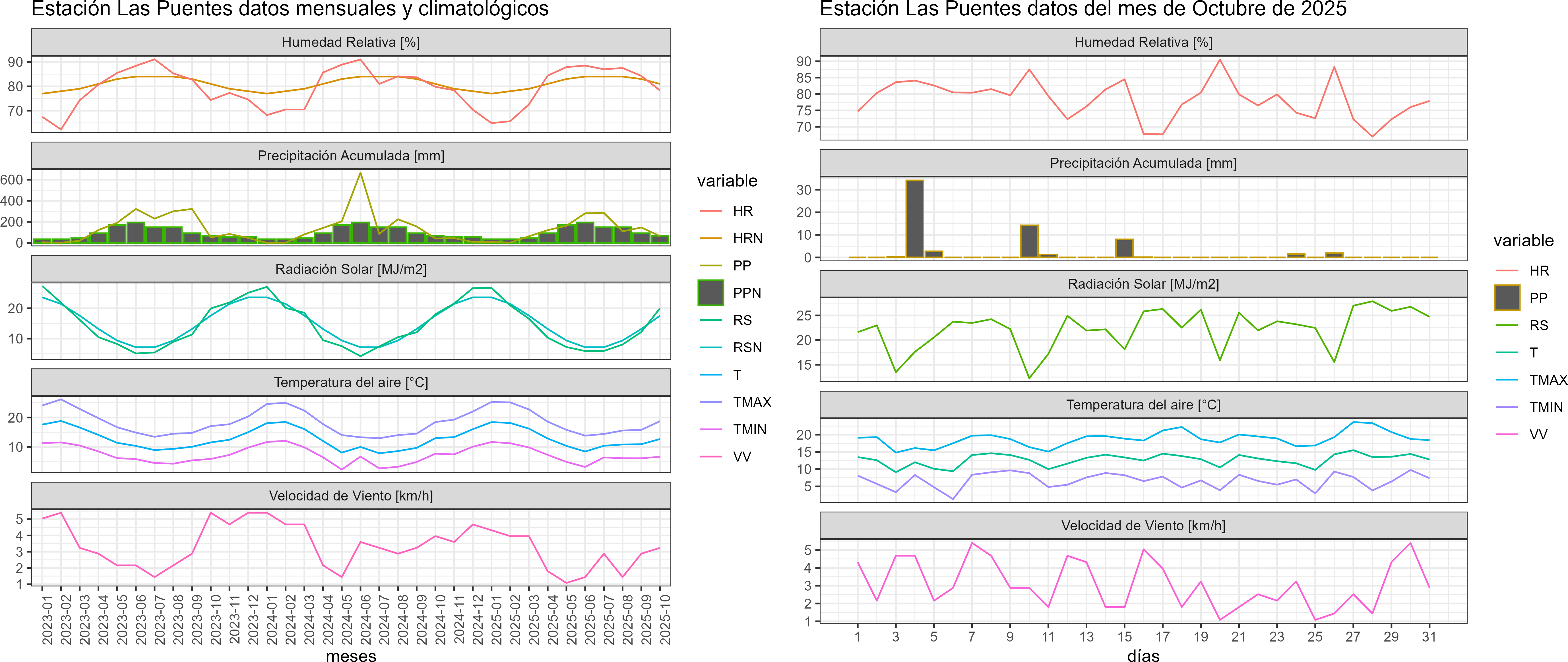La estación Las Puentes corresponde al distrito agroclimático 8-9-1. Para este distrito climático la temperatura mínima, media y máxima climatológicas alcanzan los 6.3°C, 11.2°C y 16.1°C respectivamente. Por su parte, respecto a las temperaturas medidas durante el mes de octubre en la estación: la temperatura mínima alcanzo los 6.7°C (0.4°C sobre la climatológica), la temperatura media 12.7°C (1.5°C sobre la climatológica) y la temperatura máxima llegó a los 18.8°C (2.7°C sobre la climatológica). En el mes de octubre se registró una pluviometría de 64 mm, lo cual representa un 87.7% con respecto al mismo mes de un año normal. De enero a octubre se ha registrado un total acumulado de 1238.9 mm, en circunstancias que un año normal registraría a la fecha 1248 mm, lo que representa un déficit de 0.7%. A la misma fecha, durante el año 2024 la precipitación alcanzaba los 41.4 mm.