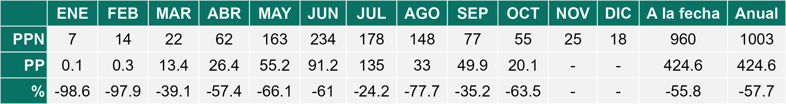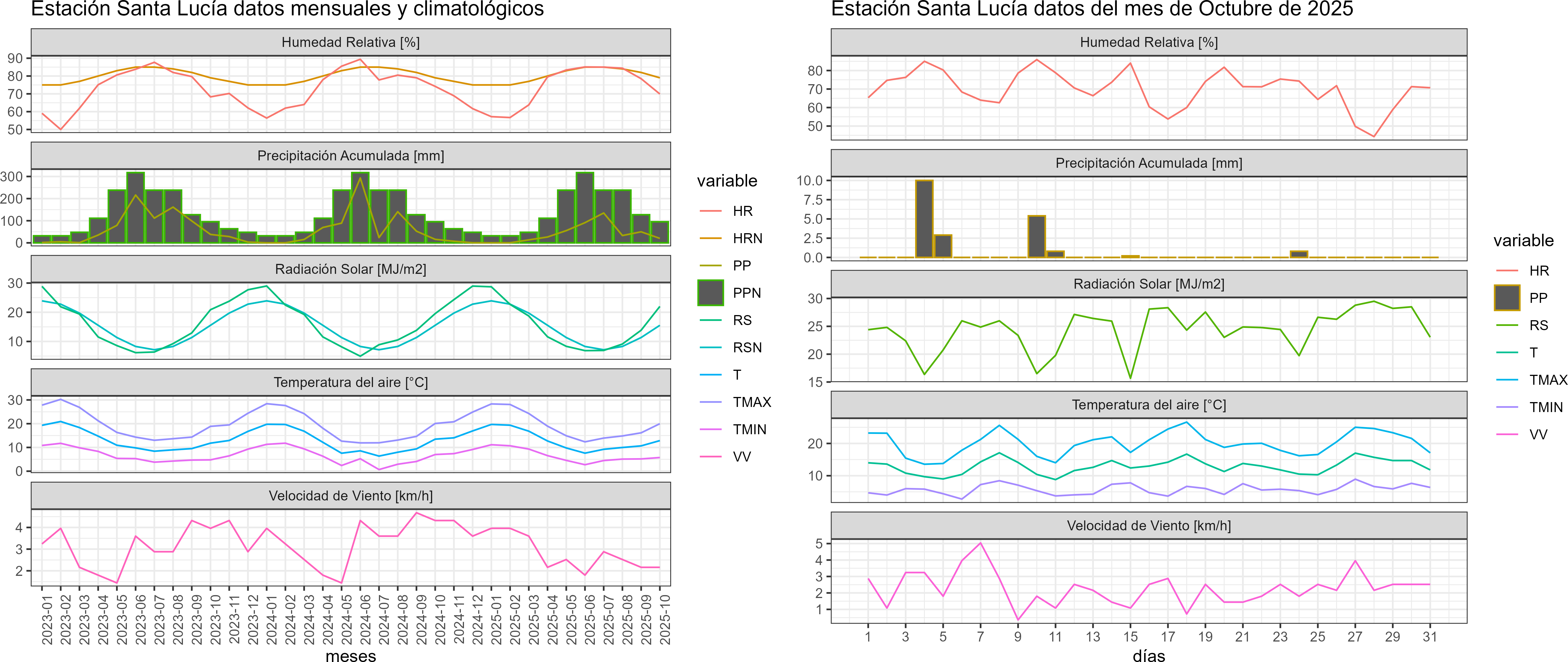 La estación Santa Lucía corresponde al distrito agroclimático 8-9-2. Para este distrito climático la temperatura mínima, media y máxima climatológicas alcanzan los 4.9°C, 11.9°C y 18.9°C respectivamente. Por su parte, respecto a las temperaturas medidas durante el mes de octubre en la estación: la temperatura mínima alcanzo los 5.7°C (0.8°C sobre la climatológica), la temperatura media 12.9°C (1°C sobre la climatológica) y la temperatura máxima llegó a los 20°C (1.1°C sobre la climatológica). En el mes de octubre se registró una pluviometría de 20.1 mm, lo cual representa un 36.5% con respecto al mismo mes de un año normal. De enero a octubre se ha registrado un total acumulado de 424.6 mm, en circunstancias que un año normal registraría a la fecha 960 mm, lo que representa un déficit de 55.8%. A la misma fecha, durante el año 2024 la precipitación alcanzaba los 15.8 mm.