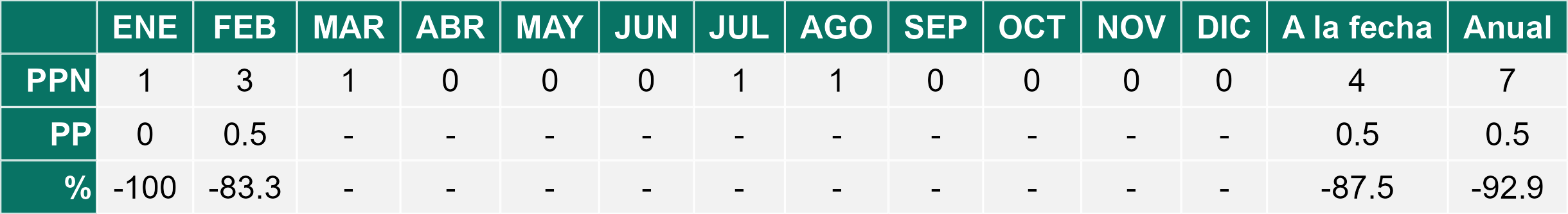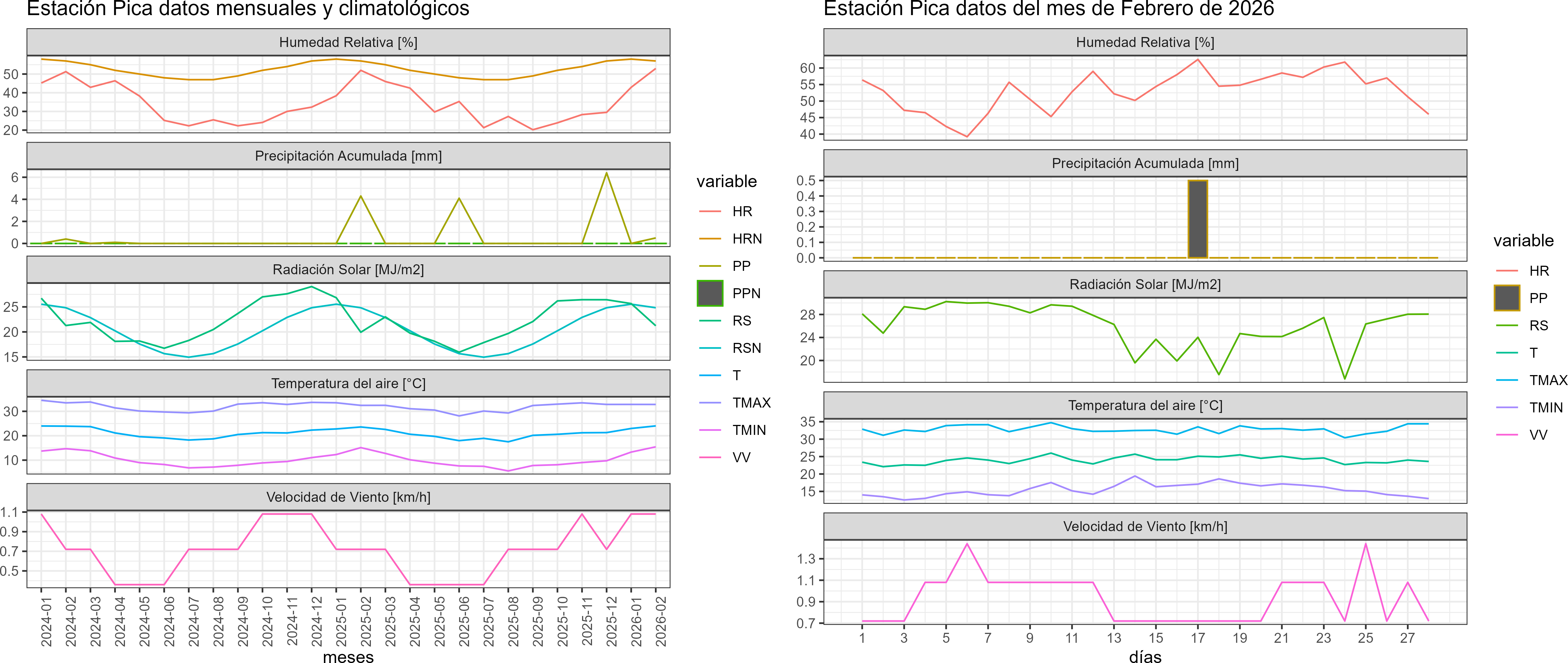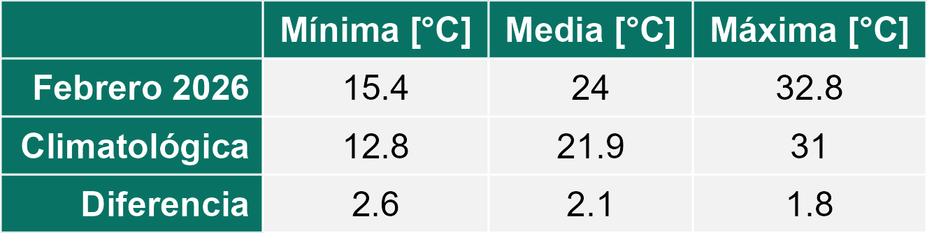 La estación Pica corresponde al distrito agroclimático 15-2-2. Para este distrito climático la temperatura mínima, media y máxima climatológicas alcanzan los 12.8°C, 21.9°C y 31°C respectivamente. Por su parte, respecto a las temperaturas medidas durante el mes de febrero en la estación: la temperatura mínima alcanzo los 15.4°C (2.6°C sobre la climatológica), la temperatura media 24°C (2.1°C sobre la climatológica) y la temperatura máxima llegó a los 32.8°C (1.8°C sobre la climatológica). En el mes de febrero se registró una pluviometría de 0.5 mm, lo cual representa un 16.7% con respecto al mismo mes de un año normal. De enero a febrero se ha registrado un total acumulado de 0.5 mm, en circunstancias que un año normal registraría a la fecha 4 mm, lo que representa un déficit de 87.5%. A la misma fecha, durante el año 2024 la precipitación alcanzaba los 4.3 mm.