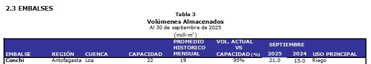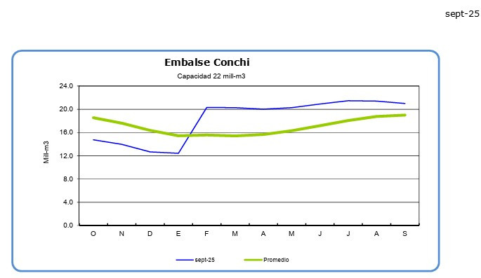 El Embalse Conchi mantiene un comportamiento estable, sin variaciones significativas respecto a meses anteriores.