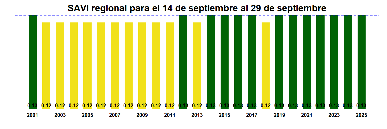 Para esta quincena se observa un SAVI promedio regional de 0.13 mientras el año pasado había sido de 0.13. El valor promedio histórico para esta región, en este período del año es de 0.13.