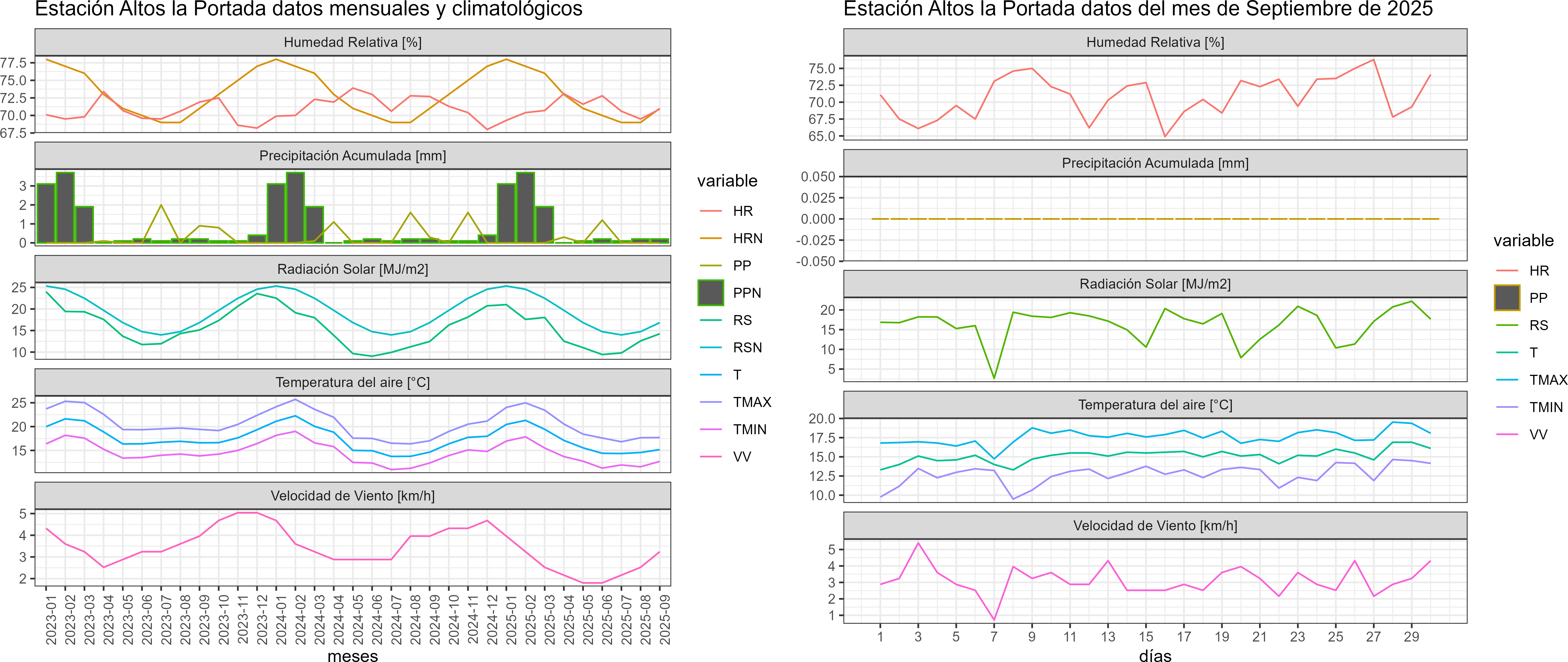 La estación Altos la Portada corresponde al distrito agroclimático 15-3-1. Para este distrito climático la temperatura mínima, media y máxima climatológicas alcanzan los 12.3°C, 15.5°C y 18.8°C respectivamente. Por su parte, respecto a las temperaturas medidas durante el mes de septiembre en la estación: la temperatura mínima alcanzo los 12.7°C (0.4°C sobre la climatológica), la temperatura media 15.1°C (-0.4°C bajo la climatológica) y la temperatura máxima llegó a los 17.6°C (-1.2°C bajo la climatológica). En el mes de septiembre se registró una pluviometría de 0 mm. De enero a septiembre se ha registrado un total acumulado de 1.5 mm, en circunstancias que un año normal registraría a la fecha 8 mm, lo que representa un déficit de 81.2%. A la misma fecha, durante el año 2024 la precipitación alcanzaba los 0.3 mm.