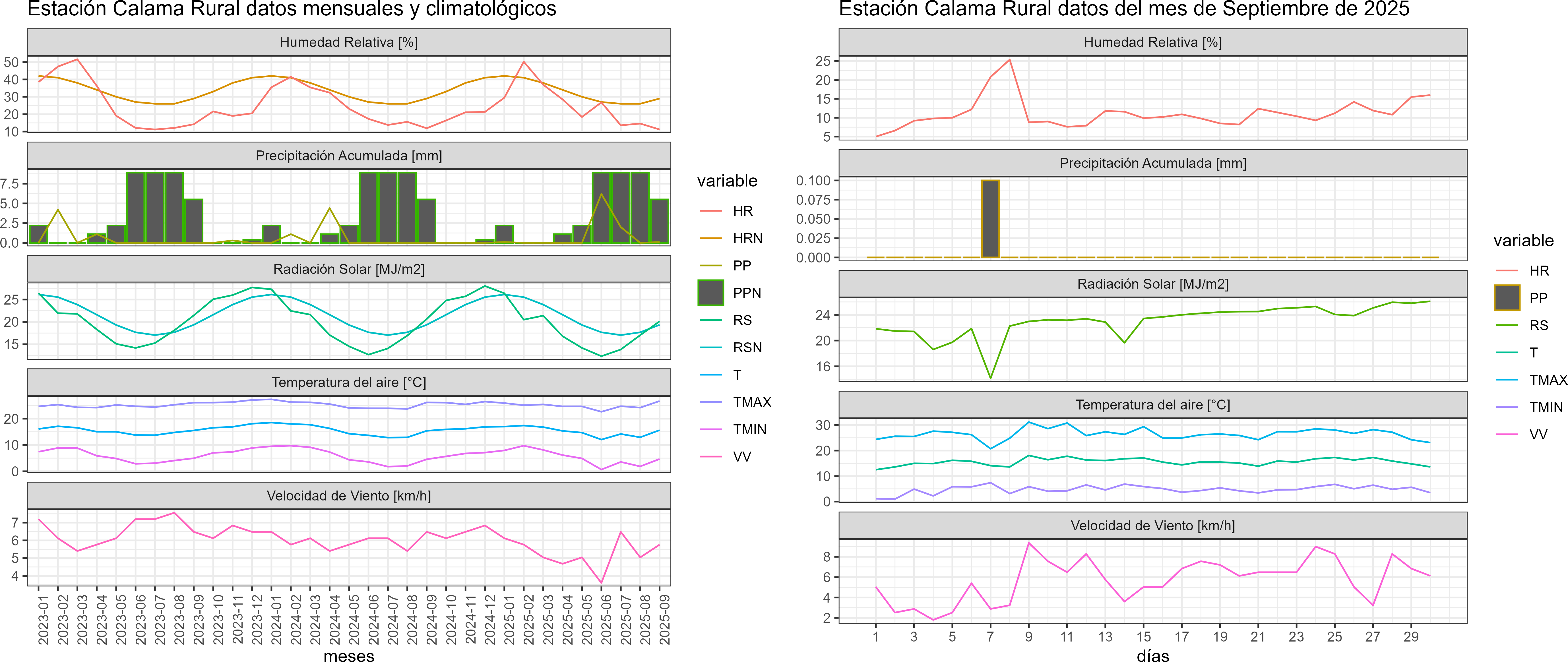 La estación Calama Rural corresponde al distrito agroclimático 15-3-4. Para este distrito climático la temperatura mínima, media y máxima climatológicas alcanzan los 2.2°C, 12.8°C y 23.4°C respectivamente. Por su parte, respecto a las temperaturas medidas durante el mes de septiembre en la estación: la temperatura mínima alcanzo los 4.8°C (2.6°C sobre la climatológica), la temperatura media 15.6°C (2.8°C sobre la climatológica) y la temperatura máxima llegó a los 26.5°C (3.1°C sobre la climatológica). En el mes de septiembre se registró una pluviometría de 0.1 mm, lo cual representa un superávit de más de un 100% De enero a septiembre se ha registrado un total acumulado de 8.4 mm, en circunstancias que un año normal registraría a la fecha 19 mm, lo que representa un déficit de 55.8%. A la misma fecha, durante el año 2024 la precipitación alcanzaba los 0 mm.