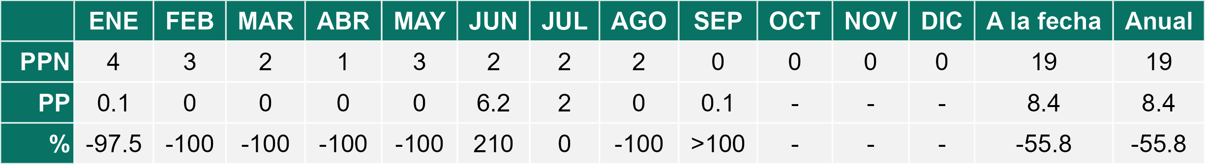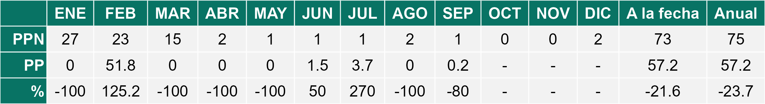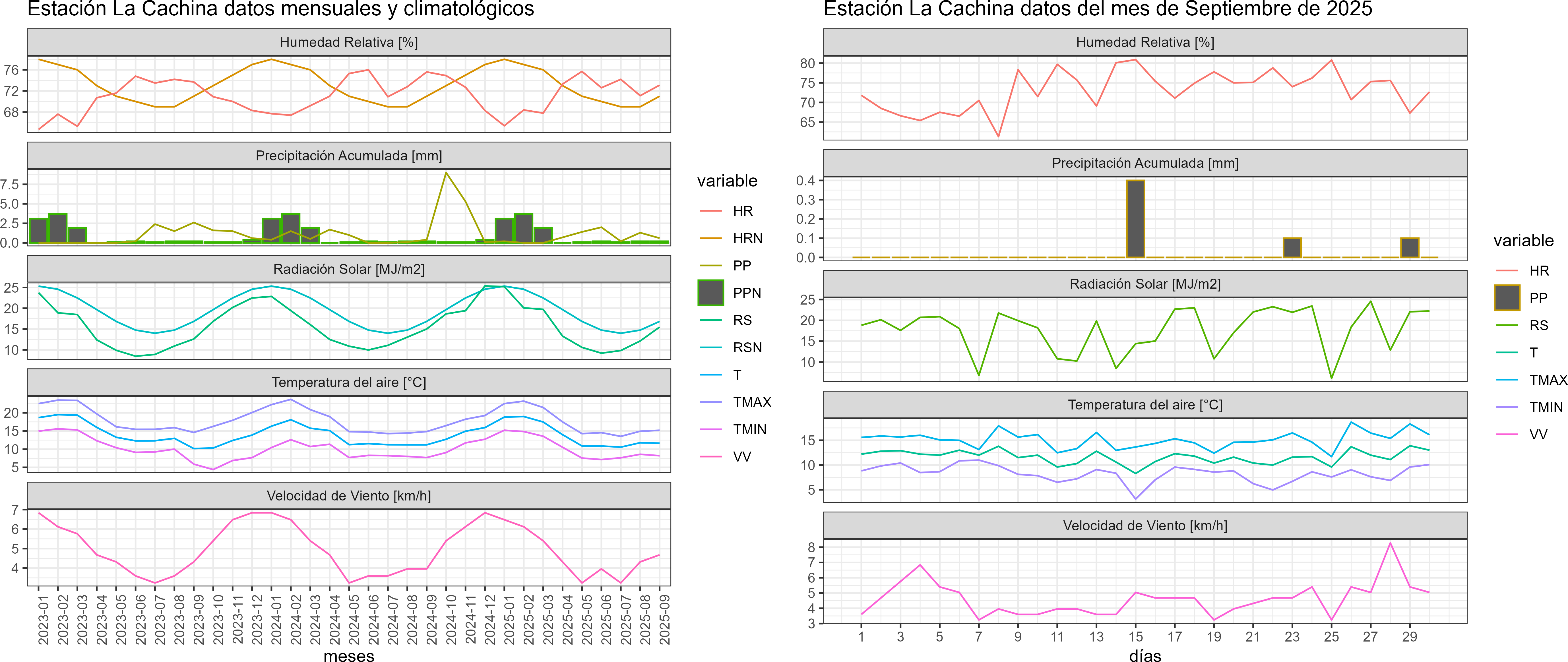 La estación La Cachina corresponde al distrito agroclimático 15-3-1. Para este distrito climático la temperatura mínima, media y máxima climatológicas alcanzan los 10.1°C, 14.4°C y 18.6°C respectivamente. Por su parte, respecto a las temperaturas medidas durante el mes de septiembre en la estación: la temperatura mínima alcanzo los 8.3°C (-1.8°C bajo la climatológica), la temperatura media 11.7°C (-2.7°C bajo la climatológica) y la temperatura máxima llegó a los 15.1°C (-3.5°C bajo la climatológica). En el mes de septiembre se registró una pluviometría de 0.6 mm, lo cual representa un 20% con respecto al mismo mes de un año normal. De enero a septiembre se ha registrado un total acumulado de 6.4 mm, en circunstancias que un año normal registraría a la fecha 18 mm, lo que representa un déficit de 64.4%. A la misma fecha, durante el año 2024 la precipitación alcanzaba los 0.4 mm.