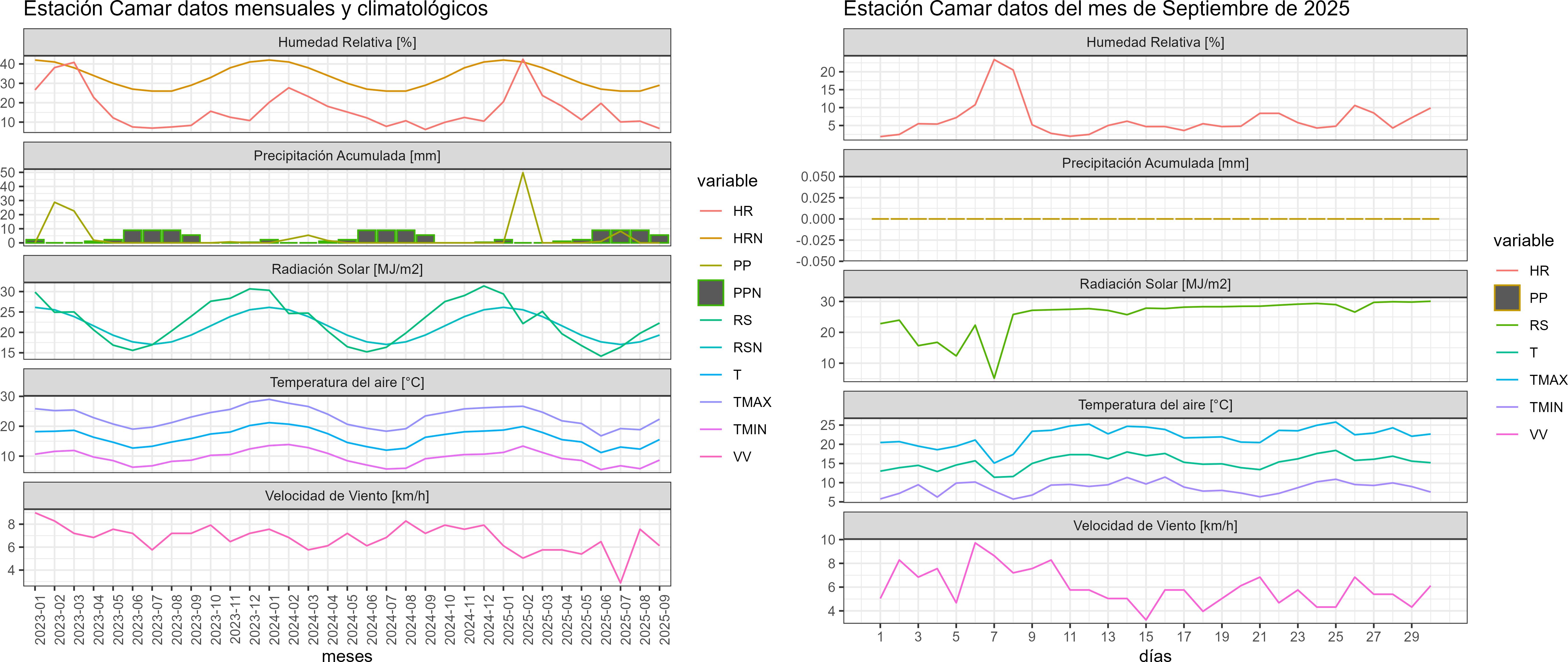 La estación Camar corresponde al distrito agroclimático 15-3-4. Para este distrito climático la temperatura mínima, media y máxima climatológicas alcanzan los 6.1°C, 15.1°C y 24°C respectivamente. Por su parte, respecto a las temperaturas medidas durante el mes de septiembre en la estación: la temperatura mínima alcanzo los 8.6°C (2.5°C sobre la climatológica), la temperatura media 15.4°C (0.3°C sobre la climatológica) y la temperatura máxima llegó a los 22.1°C (-1.9°C bajo la climatológica). En el mes de septiembre se registró una pluviometría de 0 mm, lo cual representa un 0% con respecto al mismo mes de un año normal. De enero a septiembre se ha registrado un total acumulado de 59 mm, en circunstancias que un año normal registraría a la fecha 88 mm, lo que representa un déficit de 33%. A la misma fecha, durante el año 2024 la precipitación alcanzaba los 0 mm.