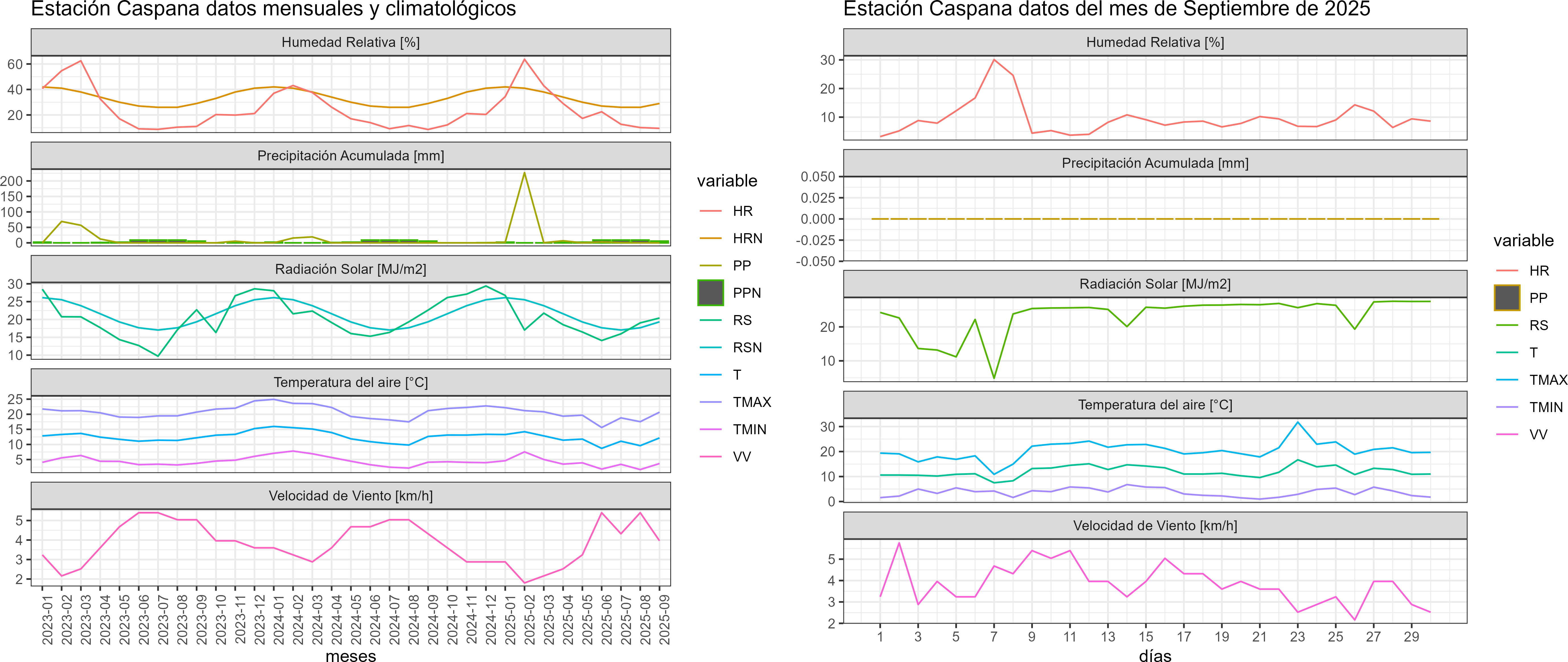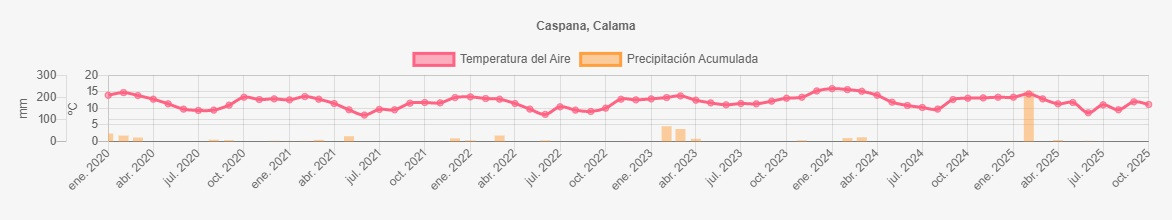 La estación Caspana corresponde al distrito agroclimático 15-3-4. Para este distrito climático la temperatura mínima, media y máxima climatológicas alcanzan los -0.4°C, 8.5°C y 17.4°C respectivamente. Por su parte, respecto a las temperaturas medidas durante el mes de septiembre en la estación: la temperatura mínima alcanzo los 3.7°C (4.1°C sobre la climatológica), la temperatura media 12°C (3.5°C sobre la climatológica) y la temperatura máxima llegó a los 20.4°C (3°C sobre la climatológica). En el mes de septiembre se registró una pluviometría de 0 mm, lo cual representa un 0% con respecto al mismo mes de un año normal. De enero a septiembre se ha registrado un total acumulado de 239.1 mm, en circunstancias que un año normal registraría a la fecha 114 mm, lo que representa un superávit de 109.7%. A la misma fecha, durante el año 2024 la precipitación alcanzaba los 0 mm.