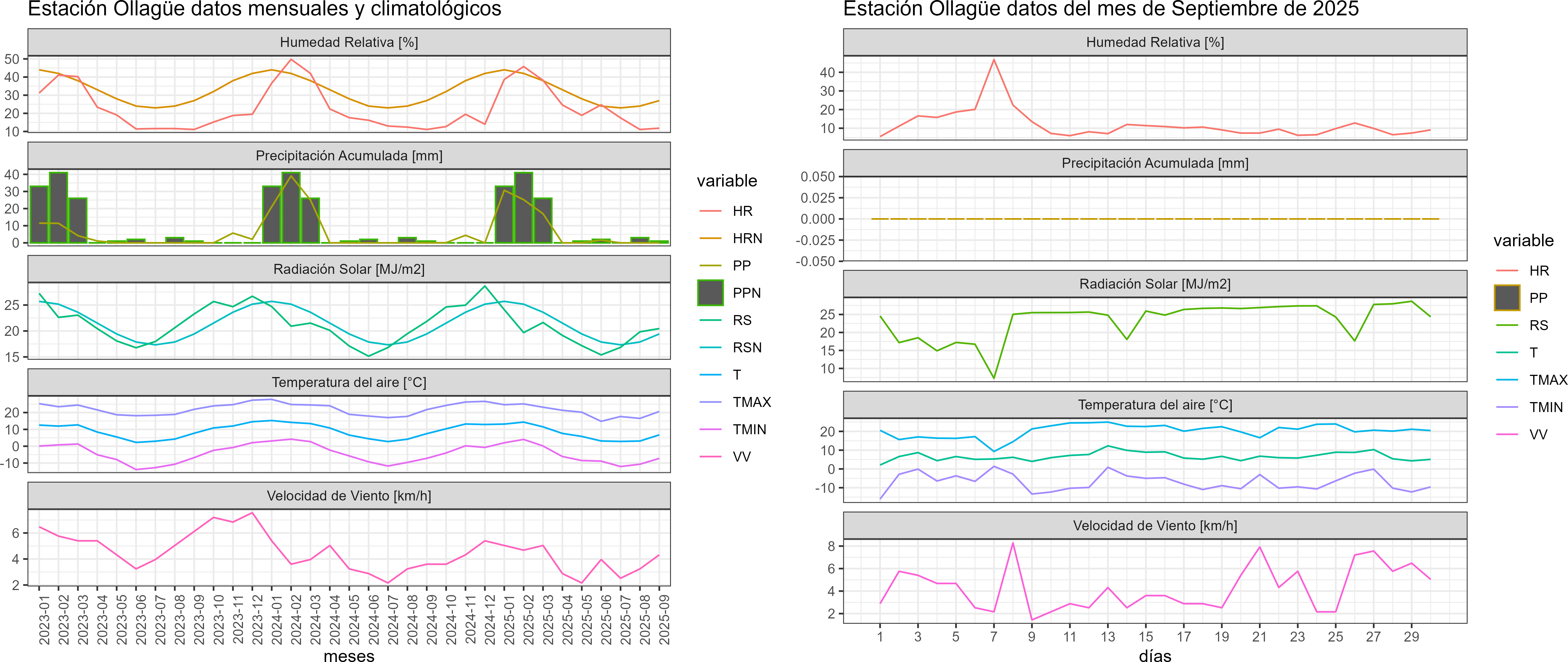 La estación Ollagüe corresponde al distrito agroclimático 15-3-5. Para este distrito climático la temperatura mínima, media y máxima climatológicas alcanzan los -5.4°C, 5.7°C y 16.7°C respectivamente. Por su parte, respecto a las temperaturas medidas durante el mes de septiembre en la estación: la temperatura mínima alcanzo los -6.9°C (-1.5°C bajo la climatológica), la temperatura media 6.7°C (1°C sobre la climatológica) y la temperatura máxima llegó a los 20.2°C (3.5°C sobre la climatológica). En el mes de septiembre se registró una pluviometría de 0 mm, lo cual representa un 0% con respecto al mismo mes de un año normal. De enero a septiembre se ha registrado un total acumulado de 74.5 mm, en circunstancias que un año normal registraría a la fecha 151 mm, lo que representa un déficit de 50.7%. A la misma fecha, durante el año 2024 la precipitación alcanzaba los 0 mm.