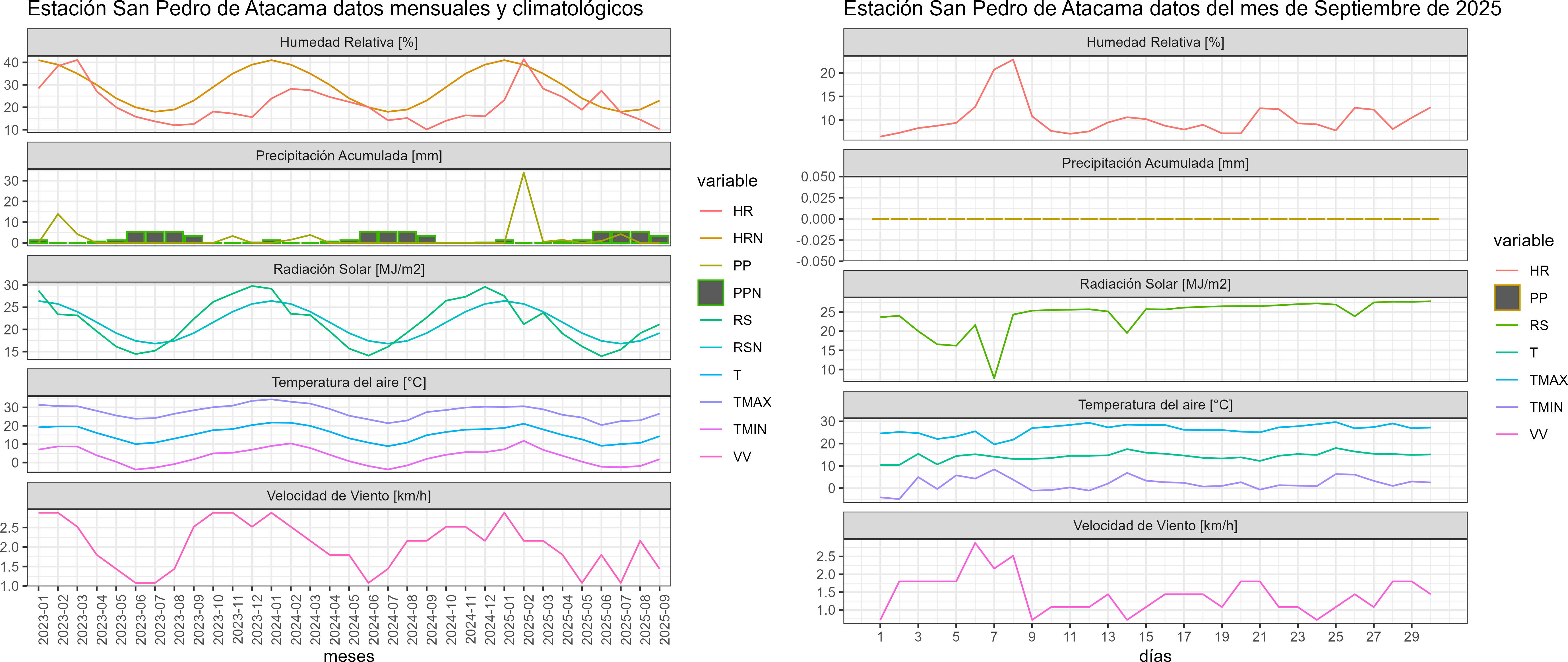 La estación San Pedro de Atacama corresponde al distrito agroclimático 2-1. Para este distrito climático la temperatura mínima, media y máxima climatológicas alcanzan los 3.3°C, 14°C y 24.7°C respectivamente. Por su parte, respecto a las temperaturas medidas durante el mes de septiembre en la estación: la temperatura mínima alcanzo los 2°C (-1.3°C bajo la climatológica), la temperatura media 14.3°C (0.3°C sobre la climatológica) y la temperatura máxima llegó a los 26.4°C (1.7°C sobre la climatológica). En el mes de septiembre se registró una pluviometría de 0 mm. De enero a septiembre se ha registrado un total acumulado de 40.9 mm, en circunstancias que un año normal registraría a la fecha 54 mm, lo que representa un déficit de 24.3%. A la misma fecha, durante el año 2024 la precipitación alcanzaba los 0 mm.