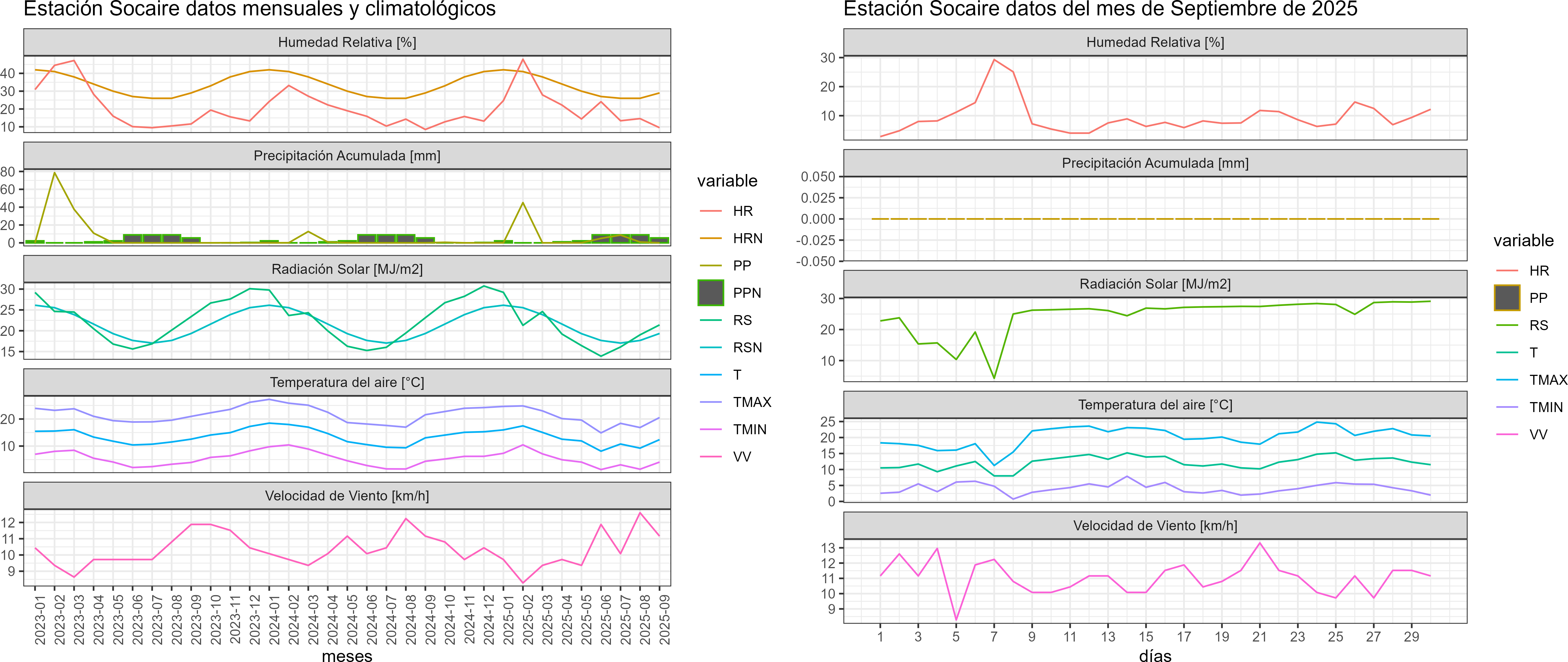 La estación Socaire corresponde al distrito agroclimático 15-3-4. Para este distrito climático la temperatura mínima, media y máxima climatológicas alcanzan los 1.6°C, 8.8°C y 16.1°C respectivamente. Por su parte, respecto a las temperaturas medidas durante el mes de septiembre en la estación: la temperatura mínima alcanzo los 4.1°C (2.5°C sobre la climatológica), la temperatura media 12.2°C (3.4°C sobre la climatológica) y la temperatura máxima llegó a los 20.2°C (4.1°C sobre la climatológica). En el mes de septiembre se registró una pluviometría de 0 mm, lo cual representa un 0% con respecto al mismo mes de un año normal. De enero a septiembre se ha registrado un total acumulado de 59.7 mm, en circunstancias que un año normal registraría a la fecha 138 mm, lo que representa un déficit de 56.7%. A la misma fecha, durante el año 2024 la precipitación alcanzaba los 0 mm.
