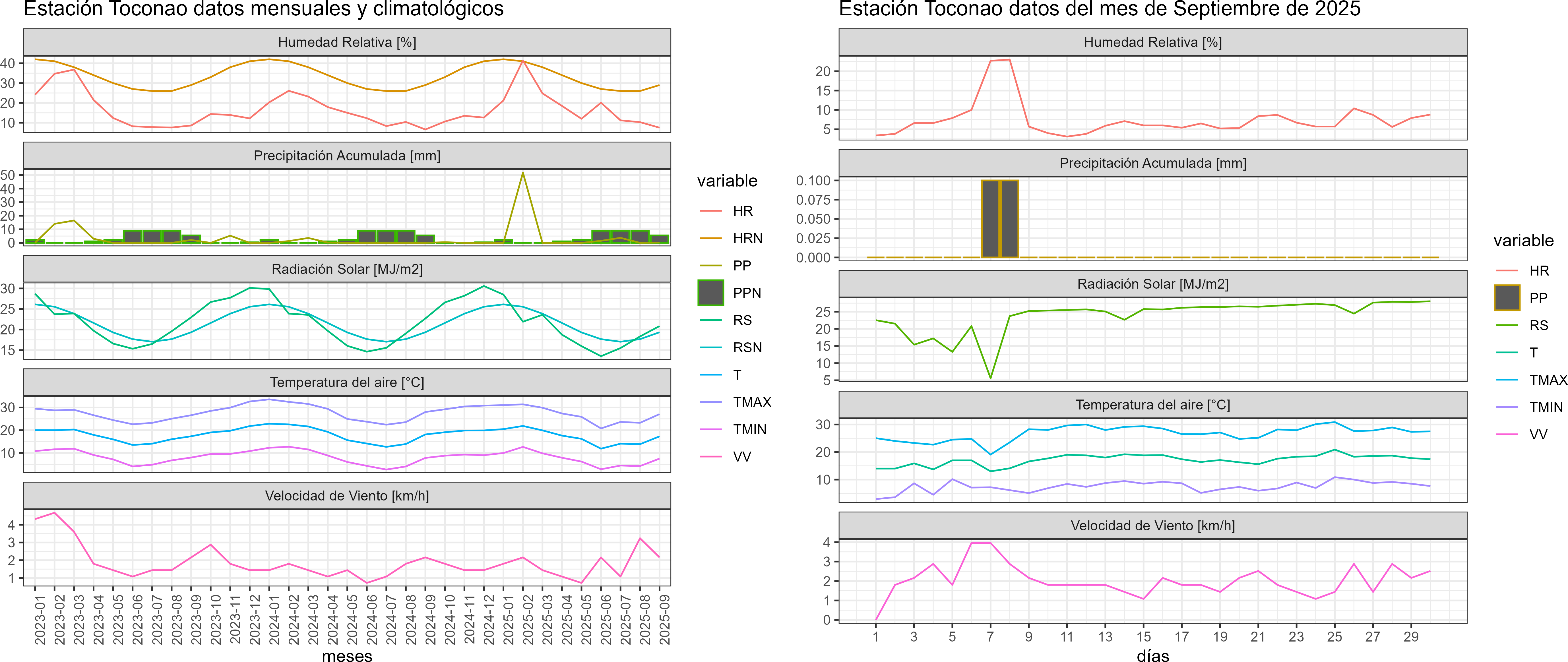 La estación Toconao corresponde al distrito agroclimático 15-3-4. Para este distrito climático la temperatura mínima, media y máxima climatológicas alcanzan los 4.4°C, 15.1°C y 25.8°C respectivamente. Por su parte, respecto a las temperaturas medidas durante el mes de septiembre en la estación: la temperatura mínima alcanzo los 7.5°C (3.1°C sobre la climatológica), la temperatura media 17.2°C (2.1°C sobre la climatológica) y la temperatura máxima llegó a los 26.8°C (1°C sobre la climatológica). En el mes de septiembre se registró una pluviometría de 0.2 mm, lo cual representa un 20% con respecto al mismo mes de un año normal. De enero a septiembre se ha registrado un total acumulado de 57.2 mm, en circunstancias que un año normal registraría a la fecha 73 mm, lo que representa un déficit de 21.6%. A la misma fecha, durante el año 2024 la precipitación alcanzaba los 0 mm.