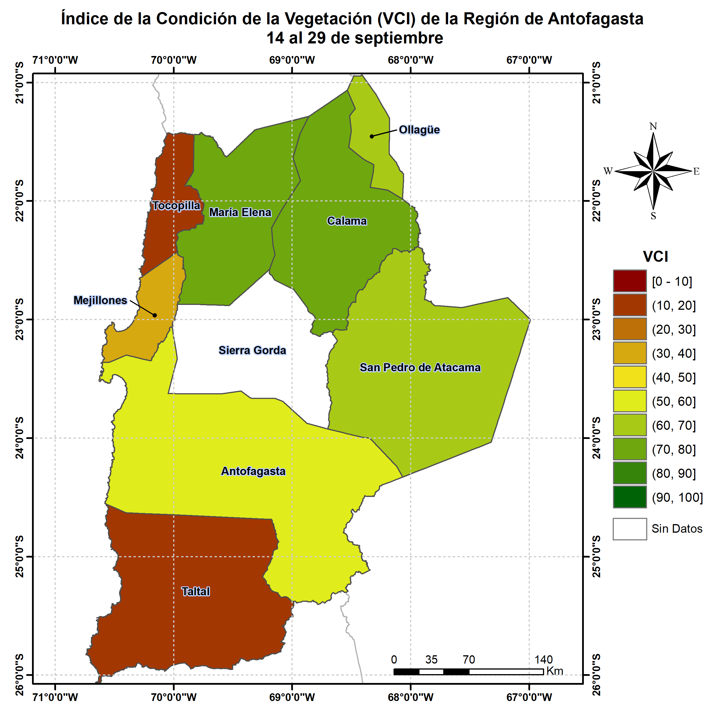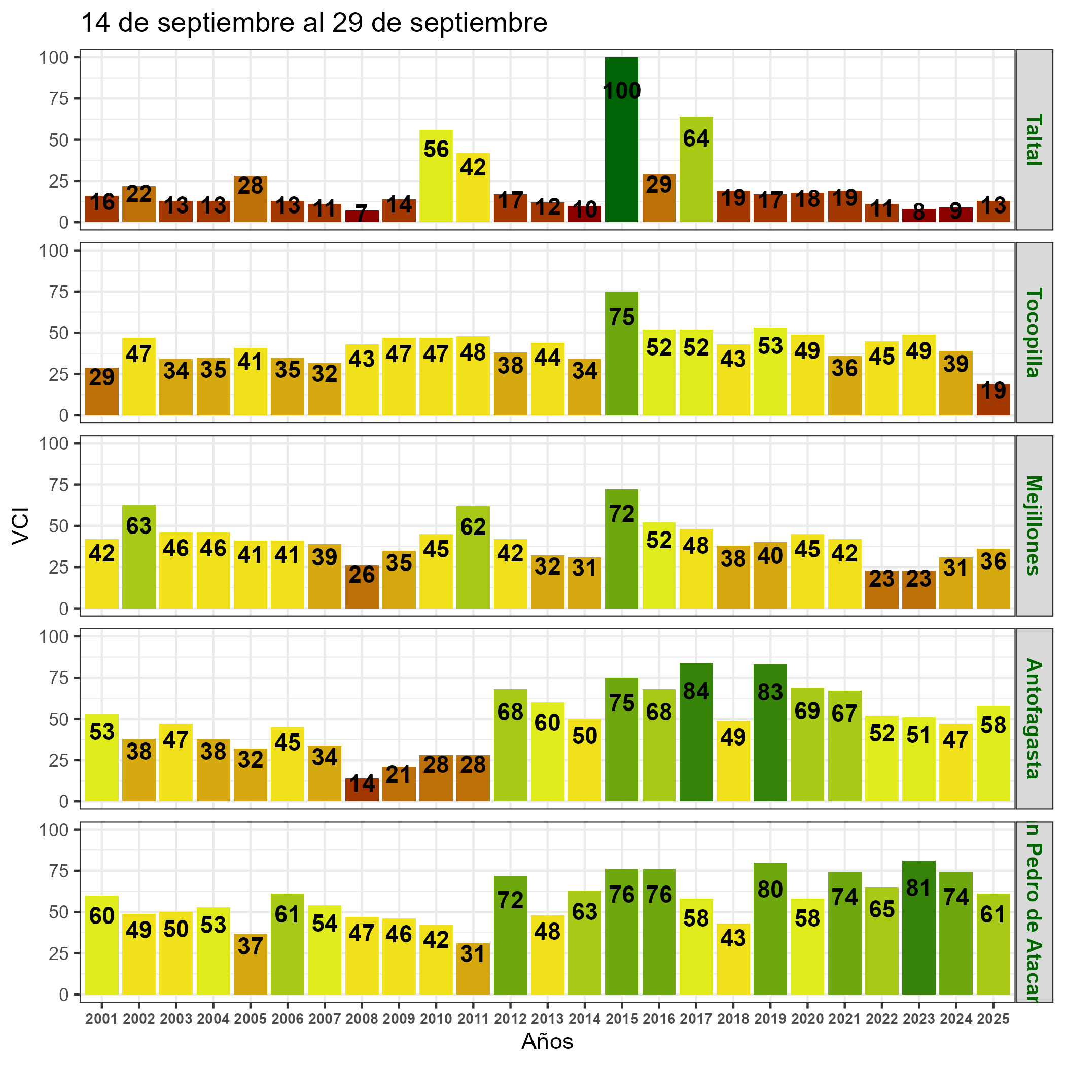 En términos globales la Región presentó un valor mediano de VCI de 61% para el período comprendido desde el 14 al 29 de septiembre. A igual período del año pasado presentaba un VCI de 55% (Fig. 1). De acuerdo a la Tabla 1 la Región de Antofagasta, en términos globales presenta una condición Favorable.
