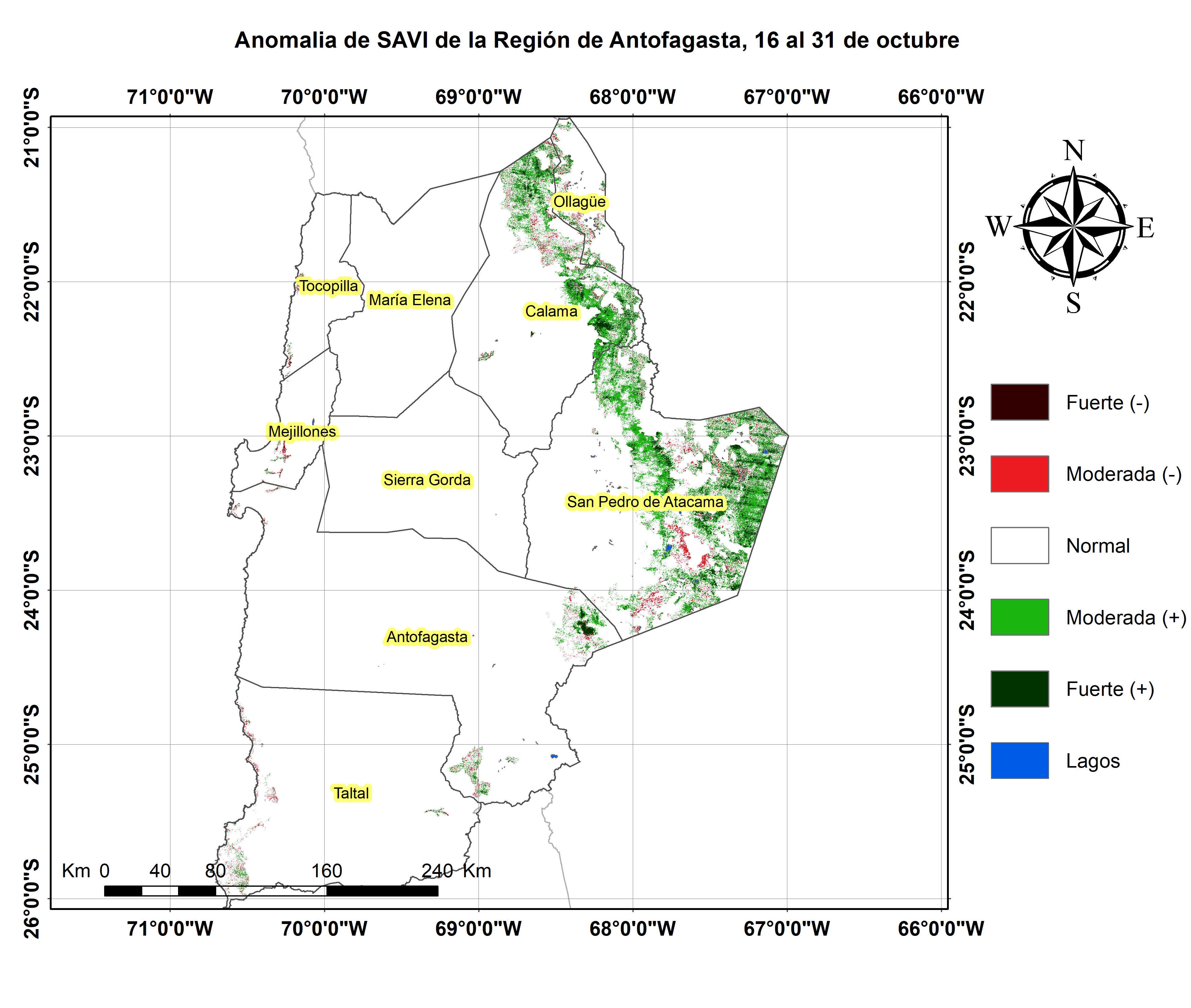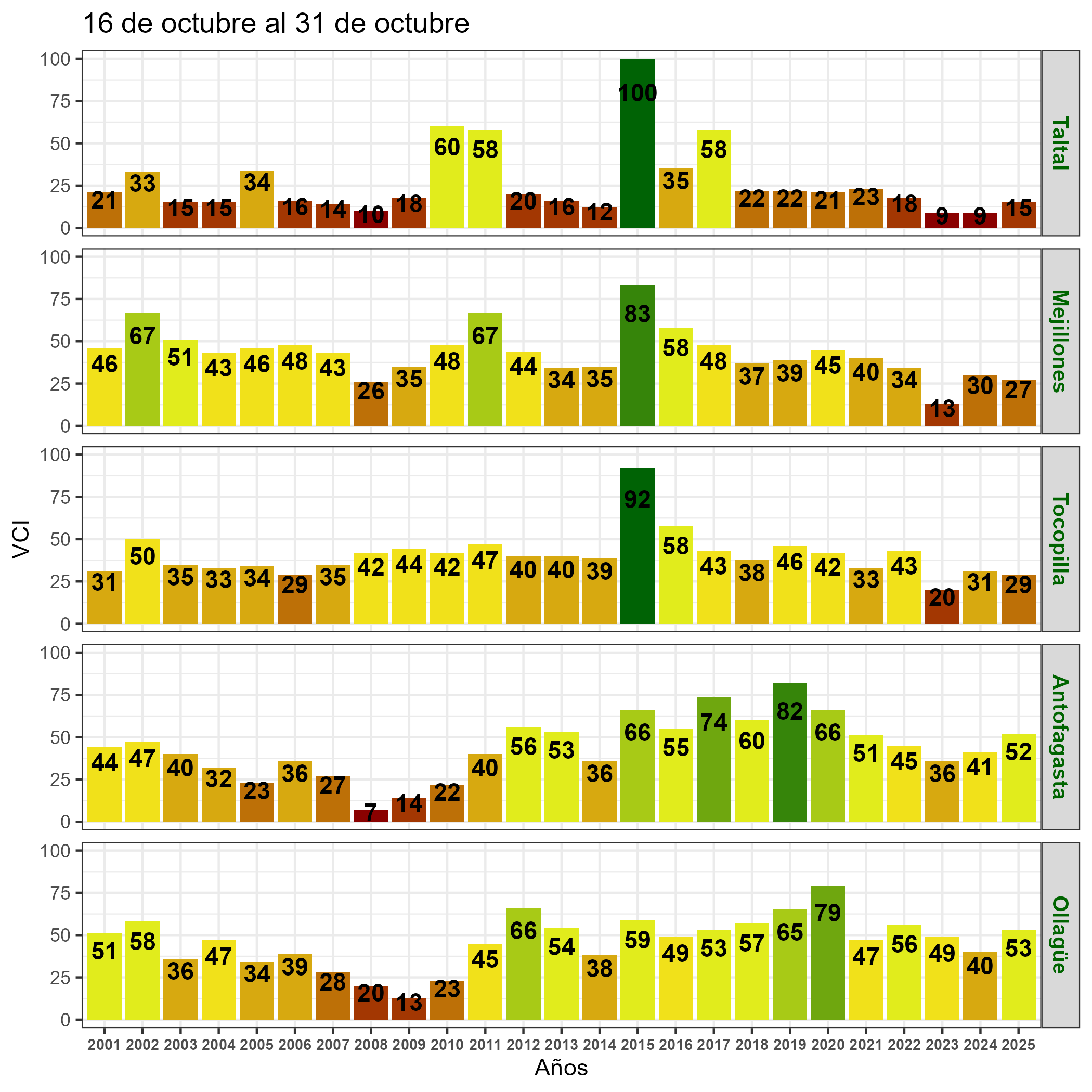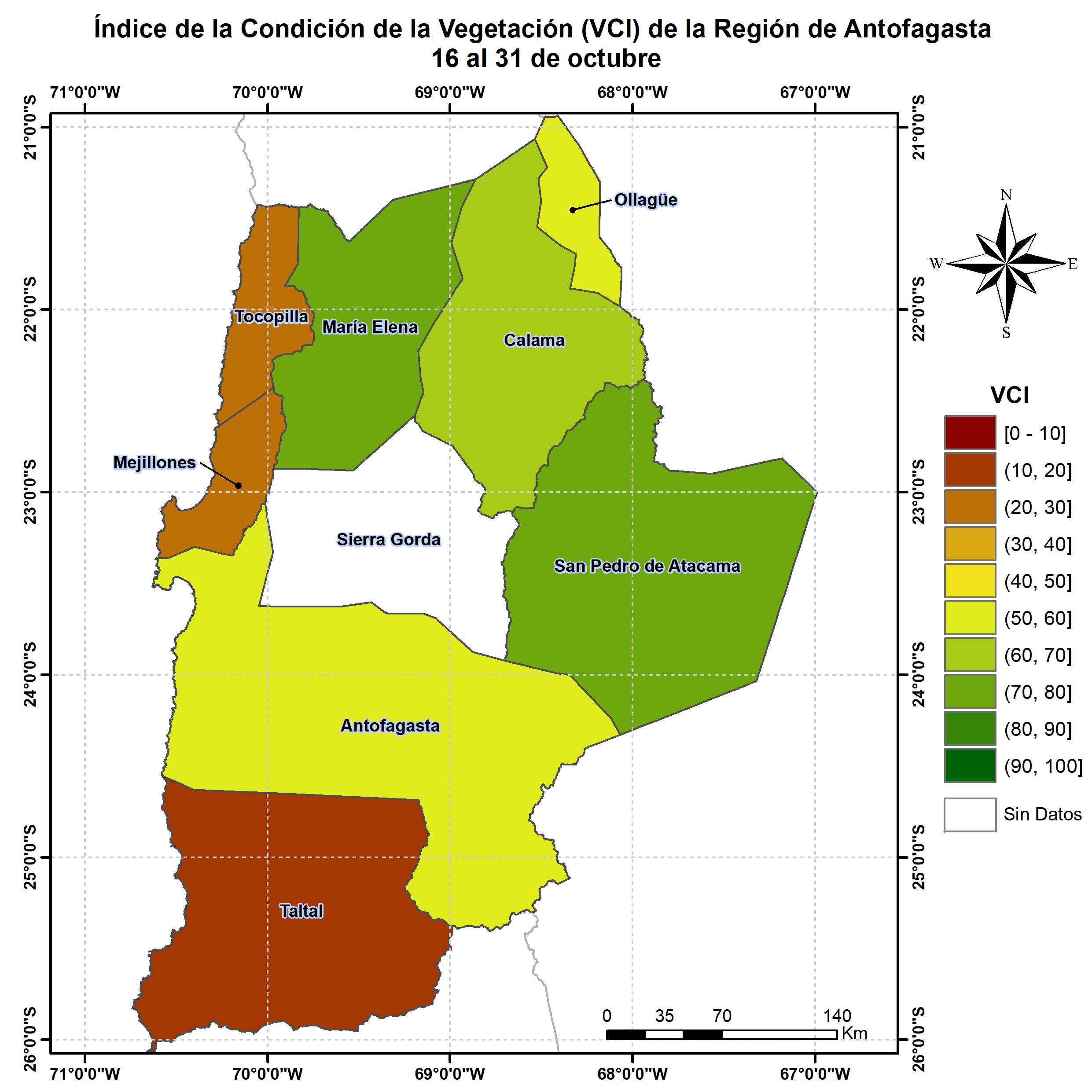 En términos globales la Región presentó un valor mediano de VCI de 70% para el período comprendido desde el 16 al 31 de octubre. A igual período del año pasado presentaba un VCI de 46% (Fig. 1). De acuerdo a la Tabla 1 la Región de Antofagasta, en términos globales presenta una condición Favorable.