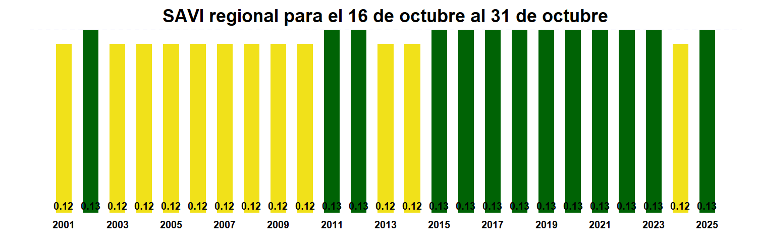 Para esta quincena se observa un SAVI promedio regional de 0.13 mientras el año pasado había sido de 0.12. El valor promedio histórico para esta región, en este período del año es de 0.13.