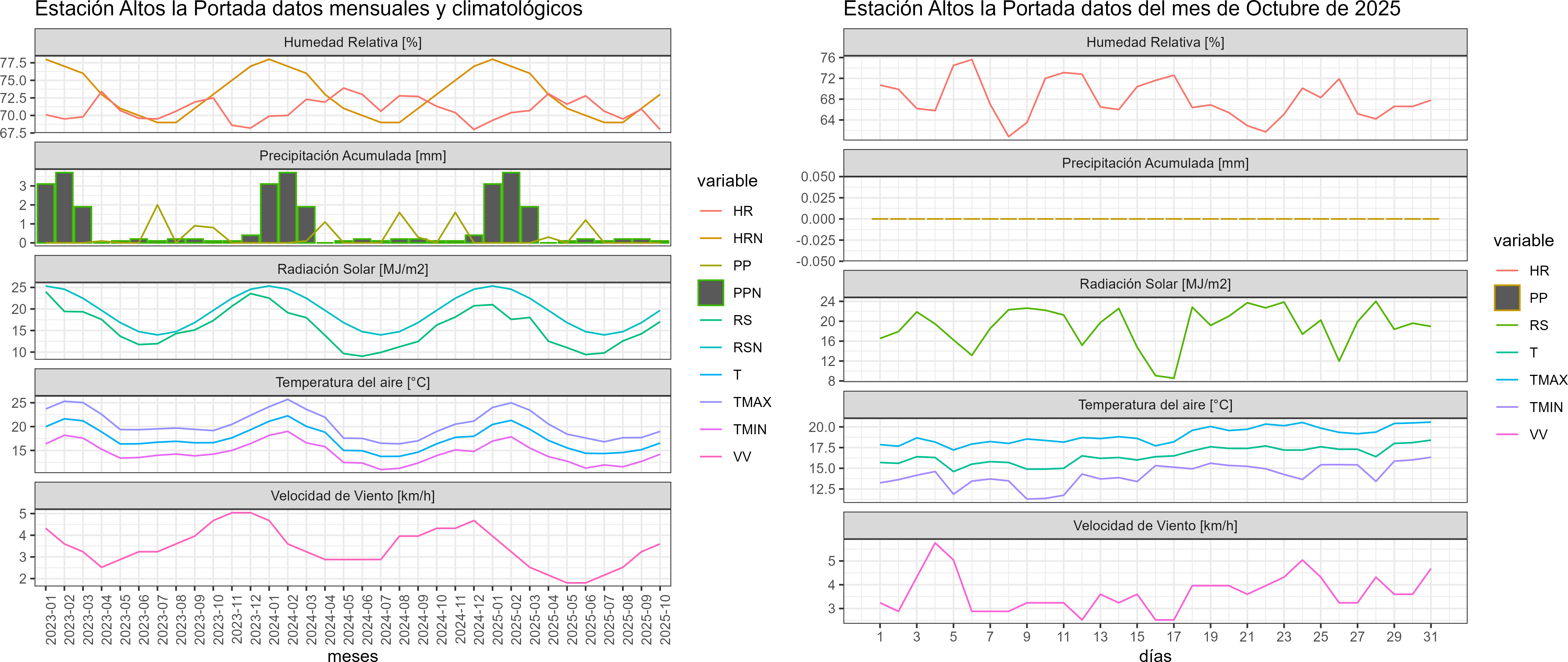 La estación Altos la Portada corresponde al distrito agroclimático 15-3-1. Para este distrito climático la temperatura mínima, media y máxima climatológicas alcanzan los 13.8°C, 16.9°C y 20°C respectivamente. Por su parte, respecto a las temperaturas medidas durante el mes de octubre en la estación: la temperatura mínima alcanzo los 14.2°C (0.4°C sobre la climatológica), la temperatura media 16.5°C (-0.4°C bajo la climatológica) y la temperatura máxima llegó a los 19°C (-1°C bajo la climatológica). En el mes de octubre se registró una pluviometría de 0 mm. De enero a octubre se ha registrado un total acumulado de 1.5 mm, en circunstancias que un año normal registraría a la fecha 8 mm, lo que representa un déficit de 81.2%. A la misma fecha, durante el año 2024 la precipitación alcanzaba los 0 mm.