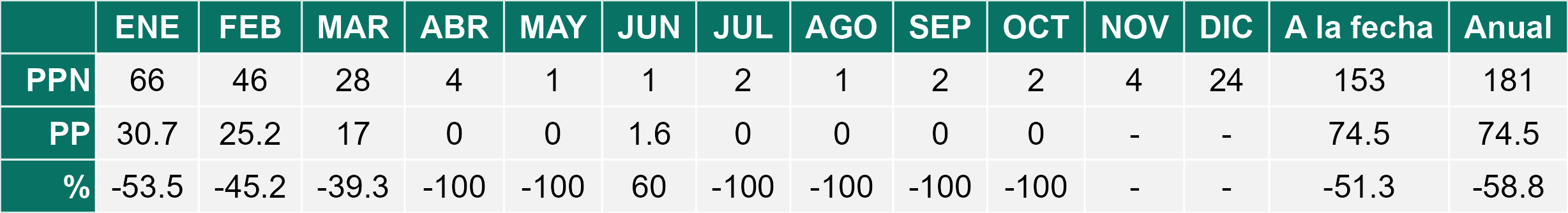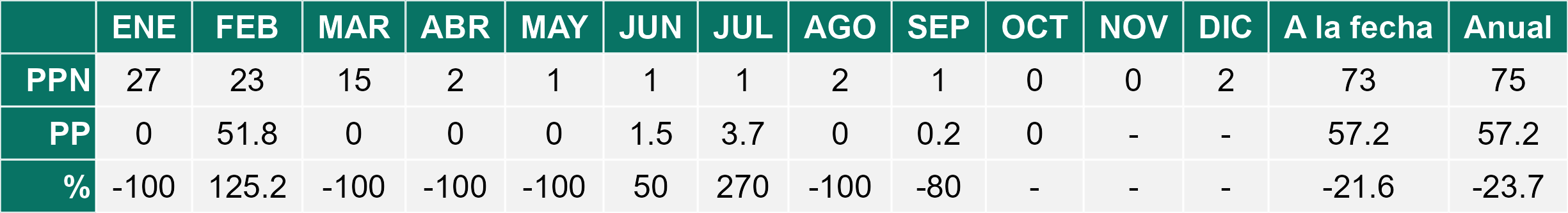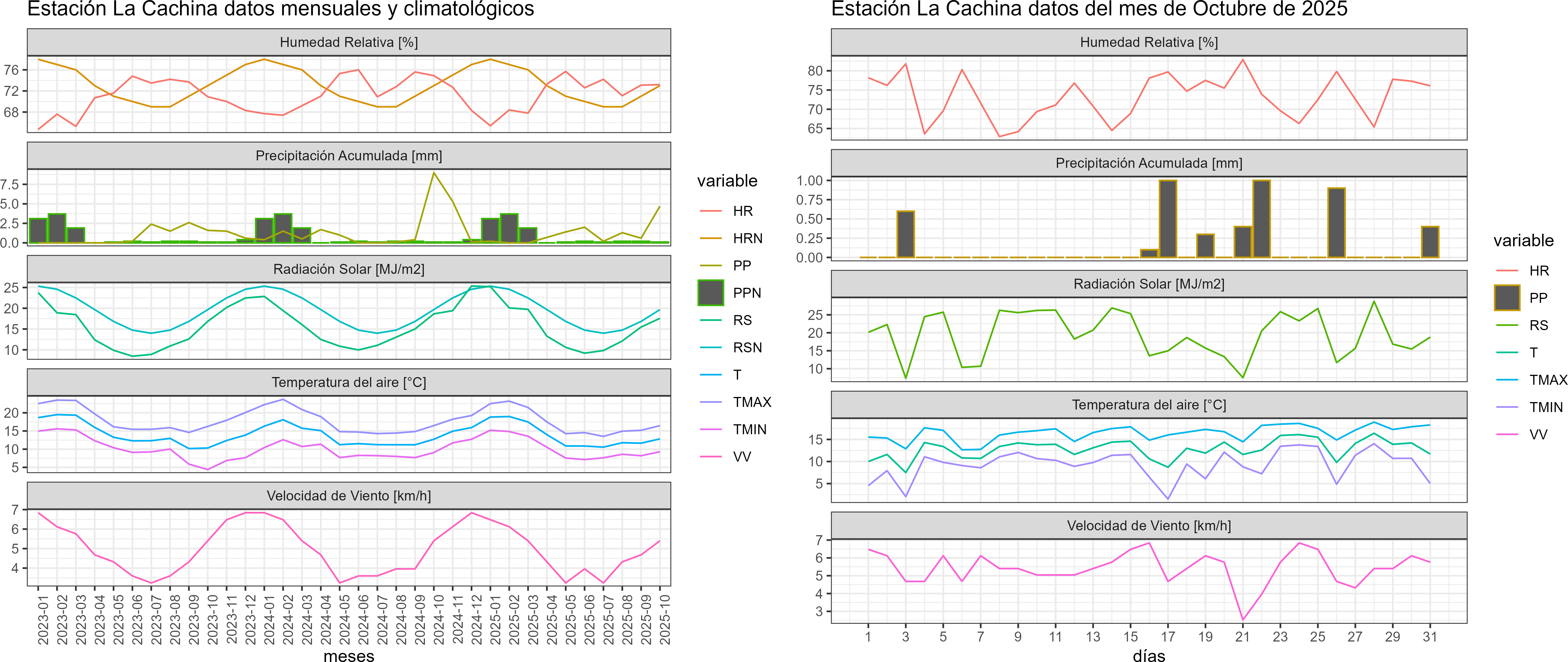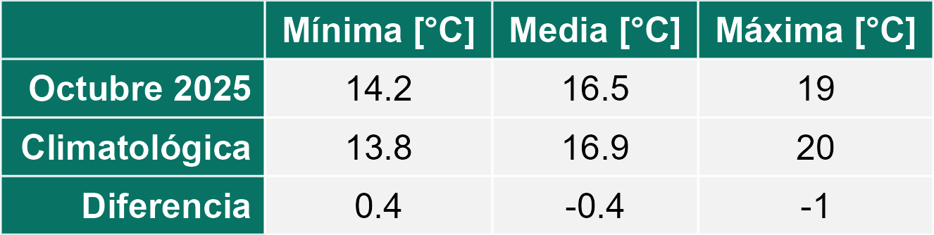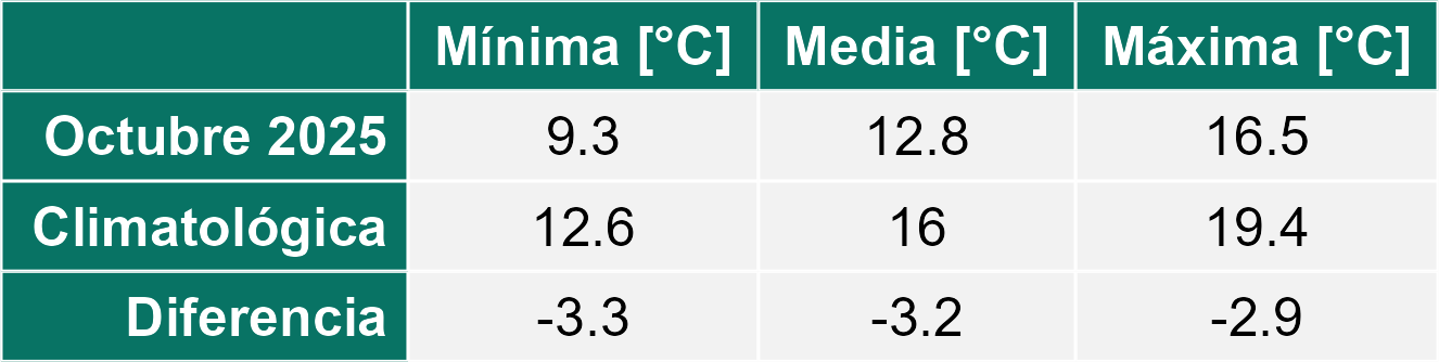 La estación La Cachina corresponde al distrito agroclimático 15-3-1. Para este distrito climático la temperatura mínima, media y máxima climatológicas alcanzan los 12.6°C, 16°C y 19.4°C respectivamente. Por su parte, respecto a las temperaturas medidas durante el mes de octubre en la estación: la temperatura mínima alcanzo los 9.3°C (-3.3°C bajo la climatológica), la temperatura media 12.8°C (-3.2°C bajo la climatológica) y la temperatura máxima llegó a los 16.5°C (-2.9°C bajo la climatológica). En el mes de octubre se registró una pluviometría de 4.7 mm, lo cual representa un 117.5% con respecto al mismo mes de un año normal. De enero a octubre se ha registrado un total acumulado de 11.1 mm, en circunstancias que un año normal registraría a la fecha 22 mm, lo que representa un déficit de 49.5%. A la misma fecha, durante el año 2024 la precipitación alcanzaba los 9 mm.