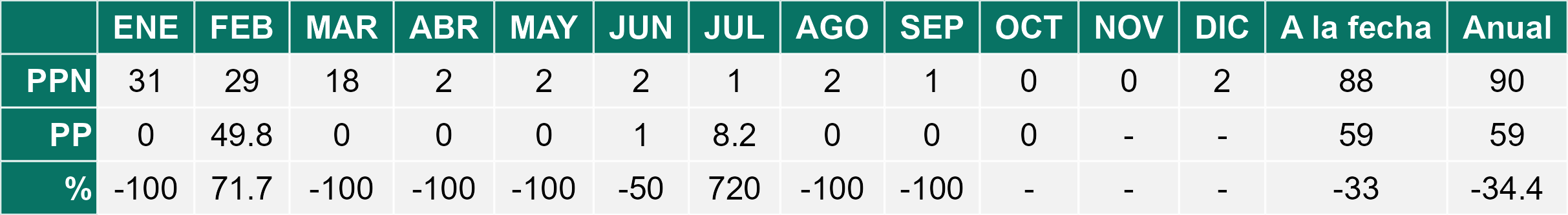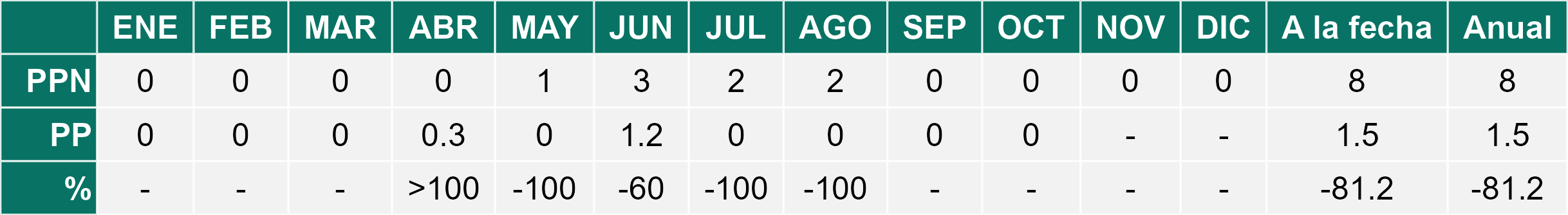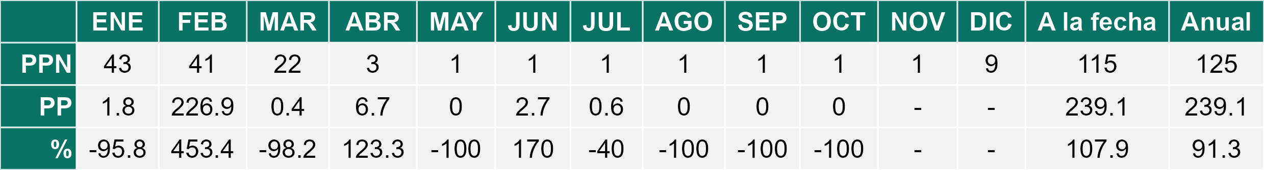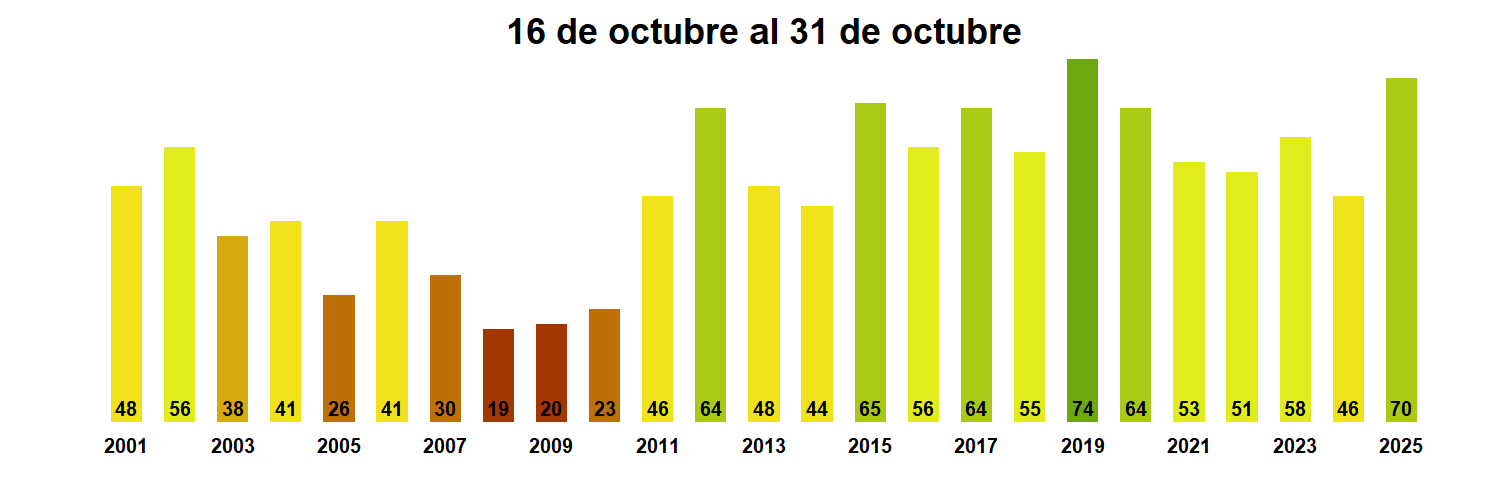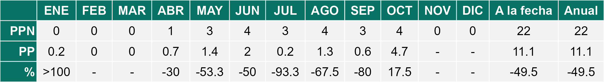 La estación La Cachina corresponde al distrito agroclimático 15-3-1. Para este distrito climático la temperatura mínima, media y máxima climatológicas alcanzan los 12.6°C, 16°C y 19.4°C respectivamente. Por su parte, respecto a las temperaturas medidas durante el mes de octubre en la estación: la temperatura mínima alcanzo los 9.3°C (-3.3°C bajo la climatológica), la temperatura media 12.8°C (-3.2°C bajo la climatológica) y la temperatura máxima llegó a los 16.5°C (-2.9°C bajo la climatológica). En el mes de octubre se registró una pluviometría de 4.7 mm, lo cual representa un 117.5% con respecto al mismo mes de un año normal. De enero a octubre se ha registrado un total acumulado de 11.1 mm, en circunstancias que un año normal registraría a la fecha 22 mm, lo que representa un déficit de 49.5%. A la misma fecha, durante el año 2024 la precipitación alcanzaba los 9 mm.