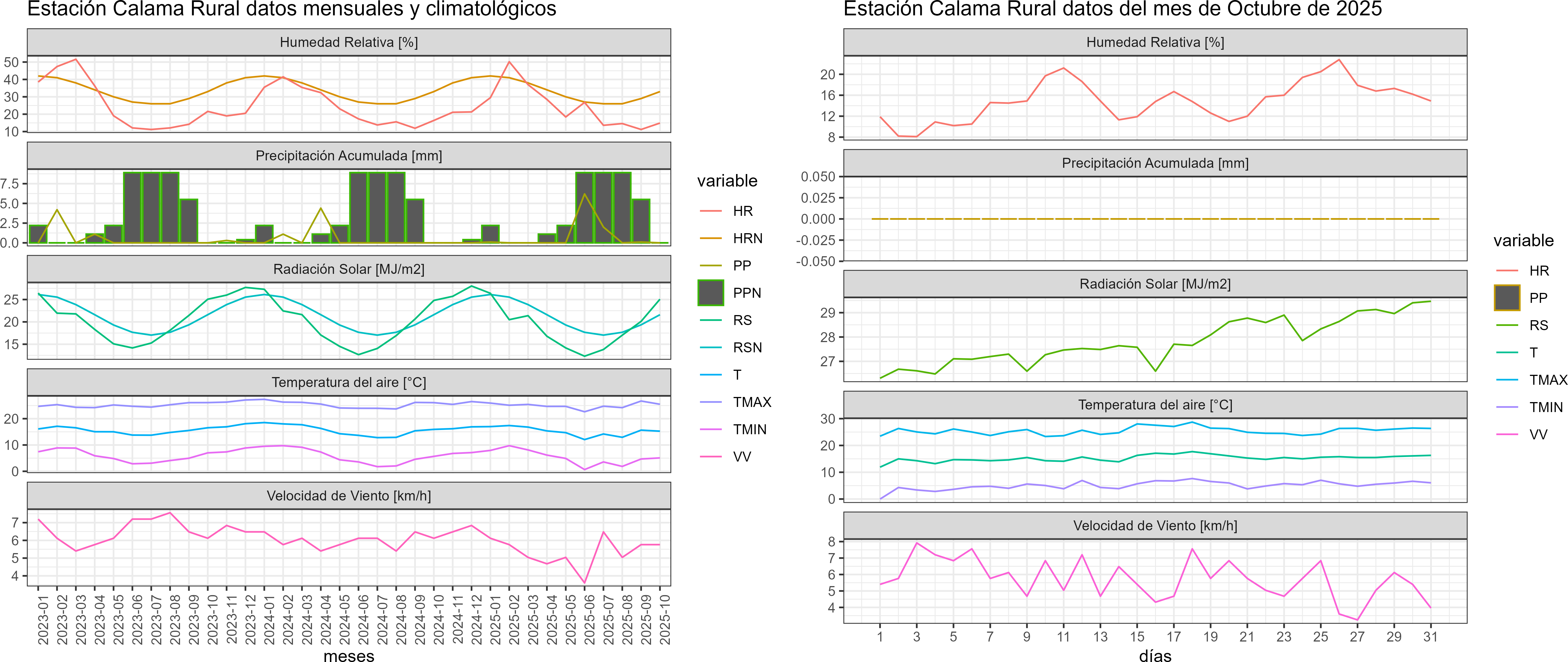 La estación Calama Rural corresponde al distrito agroclimático 15-3-4. Para este distrito climático la temperatura mínima, media y máxima climatológicas alcanzan los 3.4°C, 14°C y 24.6°C respectivamente. Por su parte, respecto a las temperaturas medidas durante el mes de octubre en la estación: la temperatura mínima alcanzo los 5.1°C (1.7°C sobre la climatológica), la temperatura media 15.3°C (1.3°C sobre la climatológica) y la temperatura máxima llegó a los 25.5°C (0.9°C sobre la climatológica). En el mes de octubre se registró una pluviometría de 0 mm. De enero a octubre se ha registrado un total acumulado de 8.4 mm, en circunstancias que un año normal registraría a la fecha 19 mm, lo que representa un déficit de 55.8%. A la misma fecha, durante el año 2024 la precipitación alcanzaba los 0 mm.
