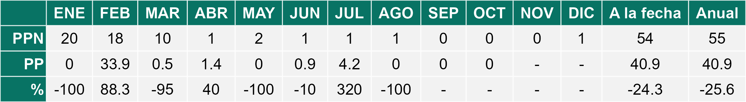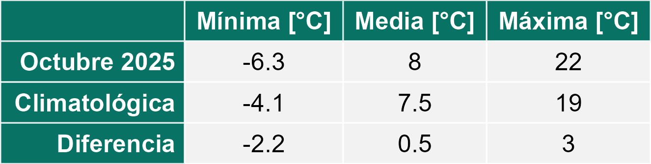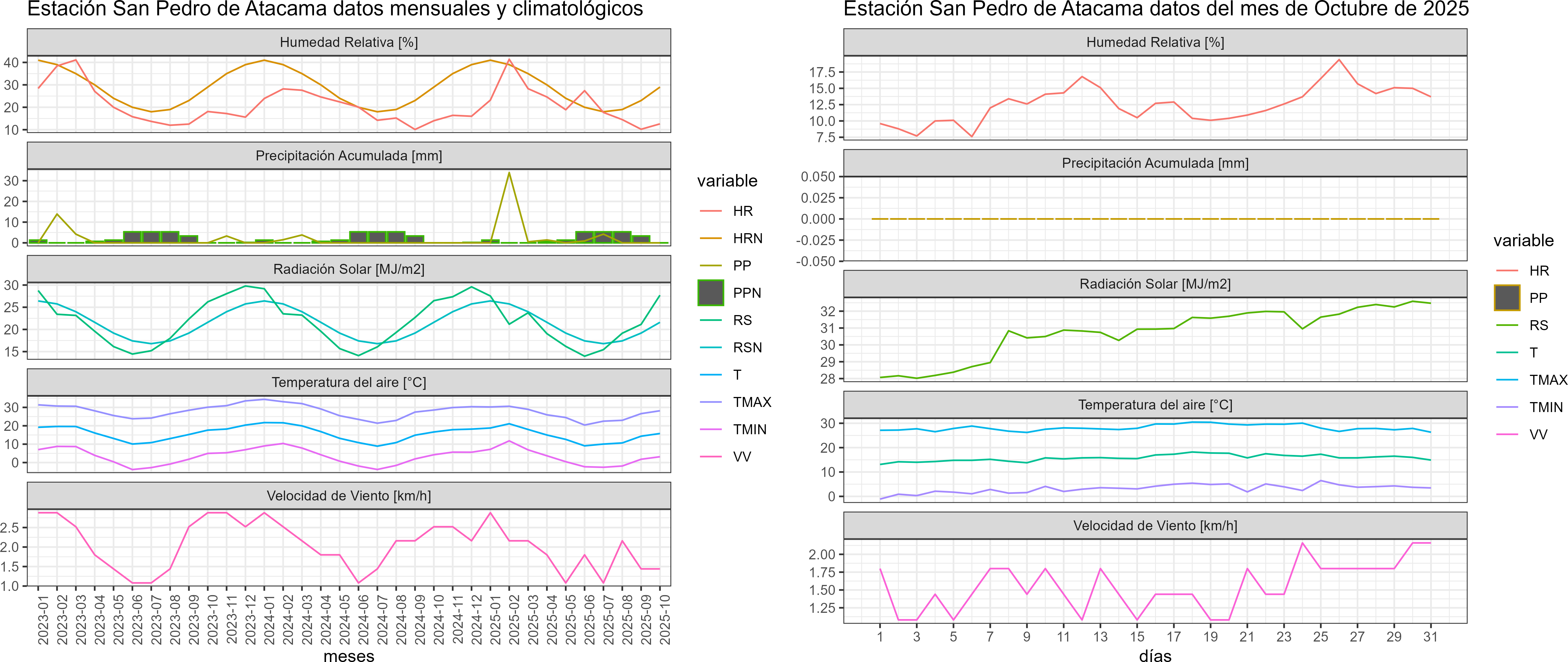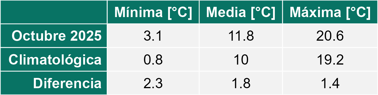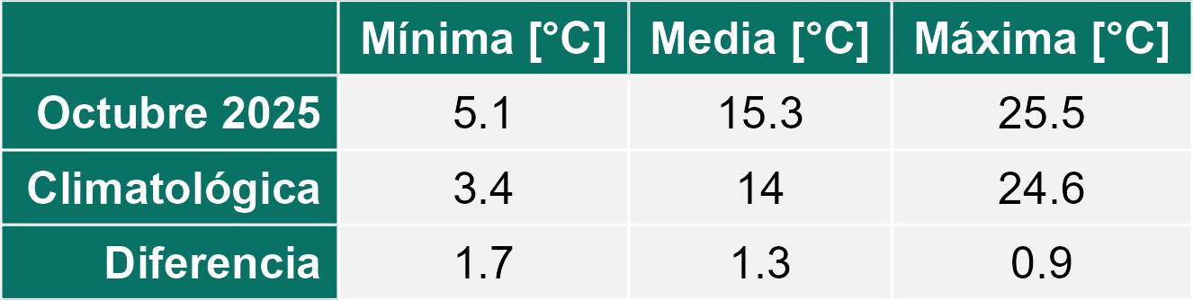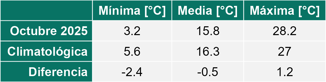 La estación San Pedro de Atacama corresponde al distrito agroclimático 2-1. Para este distrito climático la temperatura mínima, media y máxima climatológicas alcanzan los 5.6°C, 16.3°C y 27°C respectivamente. Por su parte, respecto a las temperaturas medidas durante el mes de octubre en la estación: la temperatura mínima alcanzo los 3.2°C (-2.4°C bajo la climatológica), la temperatura media 15.8°C (-0.5°C bajo la climatológica) y la temperatura máxima llegó a los 28.2°C (1.2°C sobre la climatológica). En el mes de octubre se registró una pluviometría de 0 mm. De enero a octubre se ha registrado un total acumulado de 40.9 mm, en circunstancias que un año normal registraría a la fecha 54 mm, lo que representa un déficit de 24.3%. A la misma fecha, durante el año 2024 la precipitación alcanzaba los 0 mm.