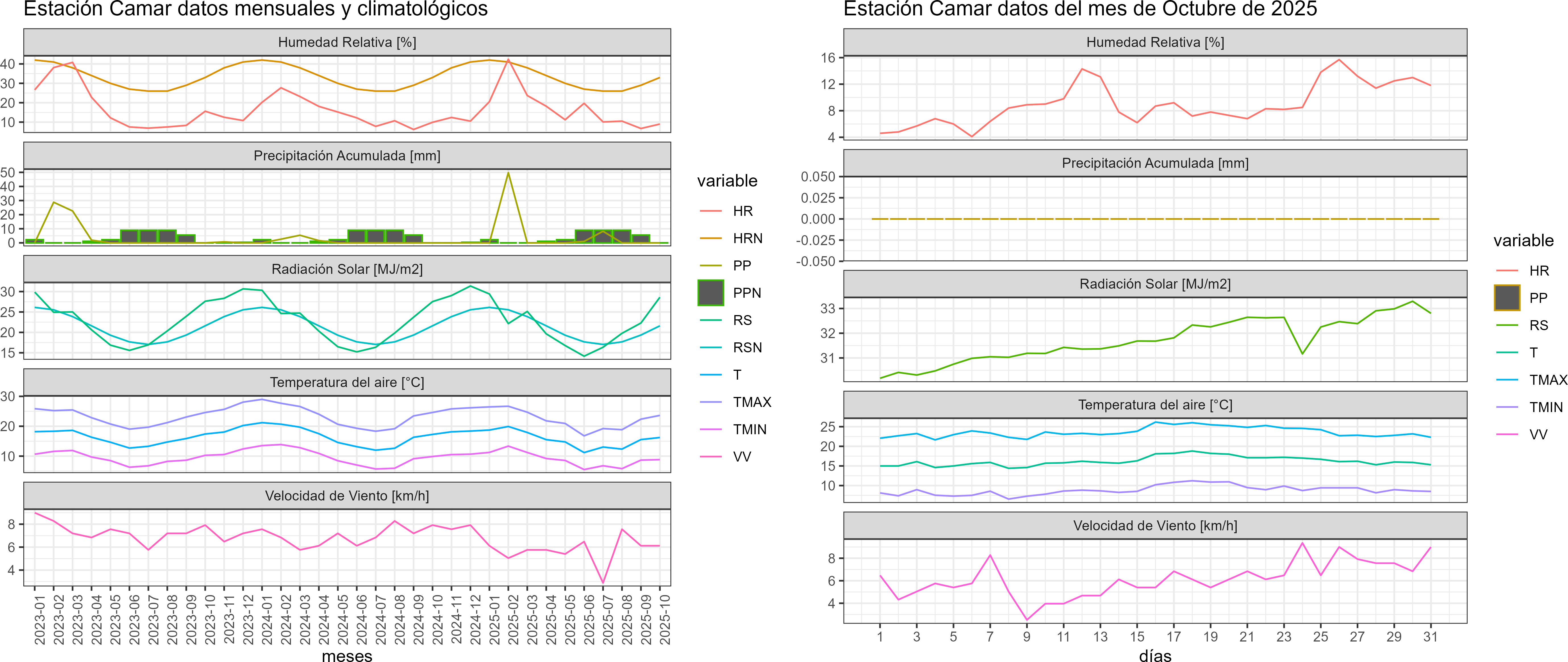 La estación Camar corresponde al distrito agroclimático 15-3-4. Para este distrito climático la temperatura mínima, media y máxima climatológicas alcanzan los 7.7°C, 17°C y 26.4°C respectivamente. Por su parte, respecto a las temperaturas medidas durante el mes de octubre en la estación: la temperatura mínima alcanzo los 8.8°C (1.1°C sobre la climatológica), la temperatura media 16.2°C (-0.8°C bajo la climatológica) y la temperatura máxima llegó a los 23.6°C (-2.8°C bajo la climatológica). En el mes de octubre se registró una pluviometría de 0 mm. De enero a octubre se ha registrado un total acumulado de 59 mm, en circunstancias que un año normal registraría a la fecha 88 mm, lo que representa un déficit de 33%. A la misma fecha, durante el año 2024 la precipitación alcanzaba los 0 mm.