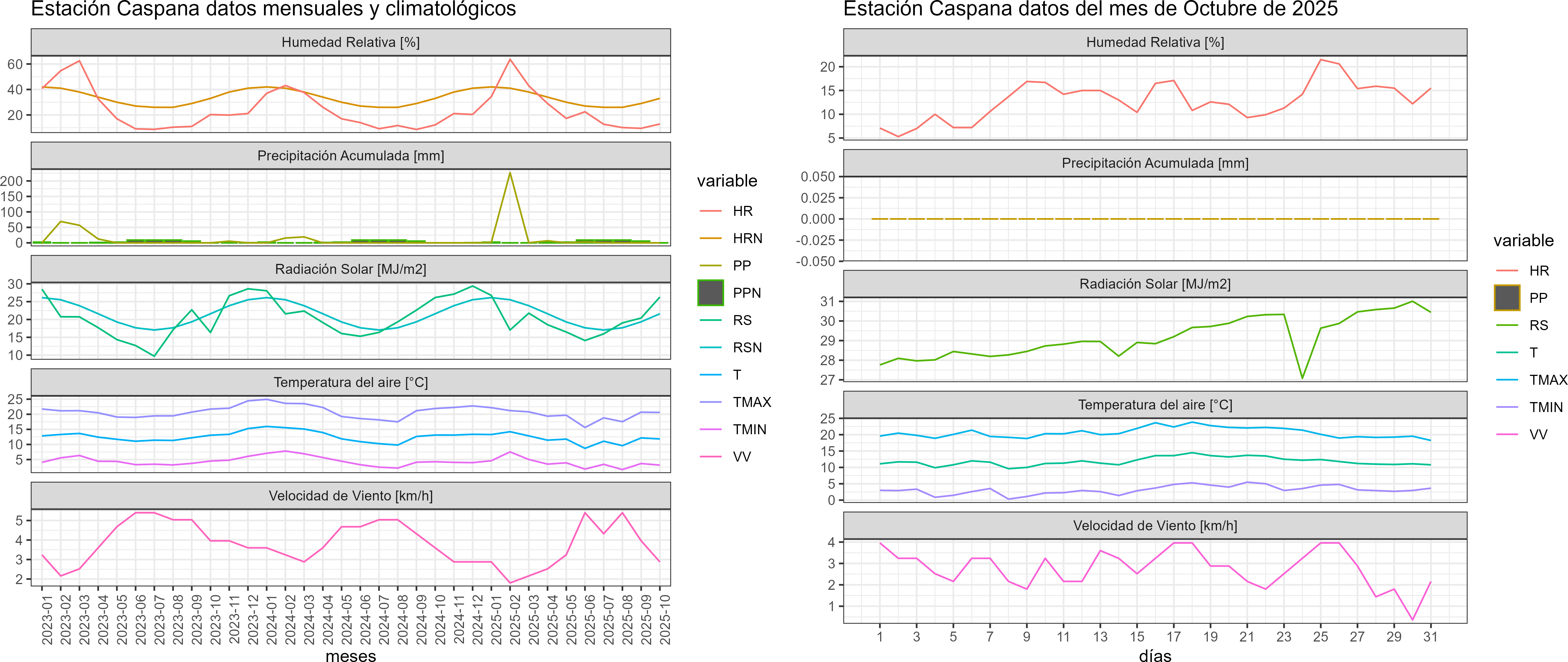 La estación Caspana corresponde al distrito agroclimático 15-3-4. Para este distrito climático la temperatura mínima, media y máxima climatológicas alcanzan los 0.8°C, 10°C y 19.2°C respectivamente. Por su parte, respecto a las temperaturas medidas durante el mes de octubre en la estación: la temperatura mínima alcanzo los 3.1°C (2.3°C sobre la climatológica), la temperatura media 11.8°C (1.8°C sobre la climatológica) y la temperatura máxima llegó a los 20.6°C (1.4°C sobre la climatológica). En el mes de octubre se registró una pluviometría de 0 mm, lo cual representa un 0% con respecto al mismo mes de un año normal. De enero a octubre se ha registrado un total acumulado de 239.1 mm, en circunstancias que un año normal registraría a la fecha 115 mm, lo que representa un superávit de 107.9%. A la misma fecha, durante el año 2024 la precipitación alcanzaba los 0 mm.